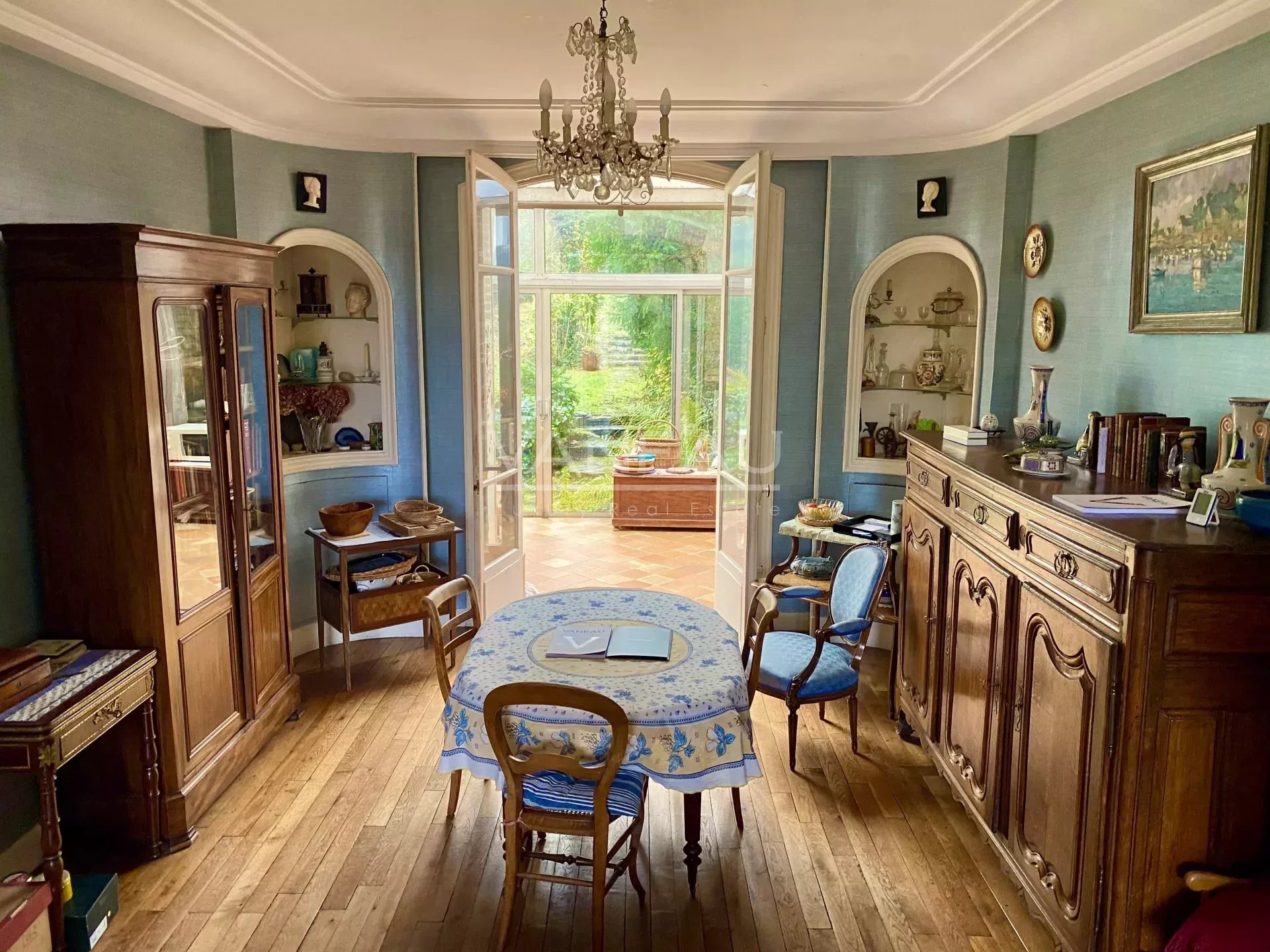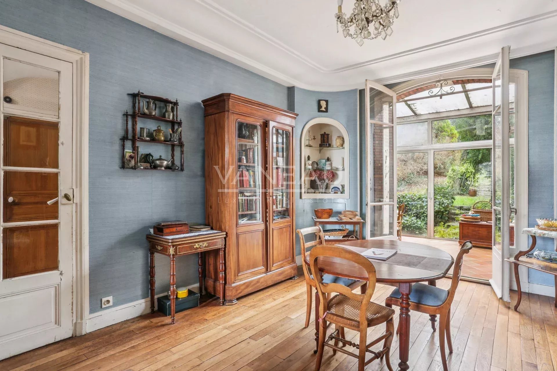 – d’un double séjour lumineux, avec parquet et moulures et une belle hauteur sous plafond, prolongé par une véranda tournée vers le jardin ;