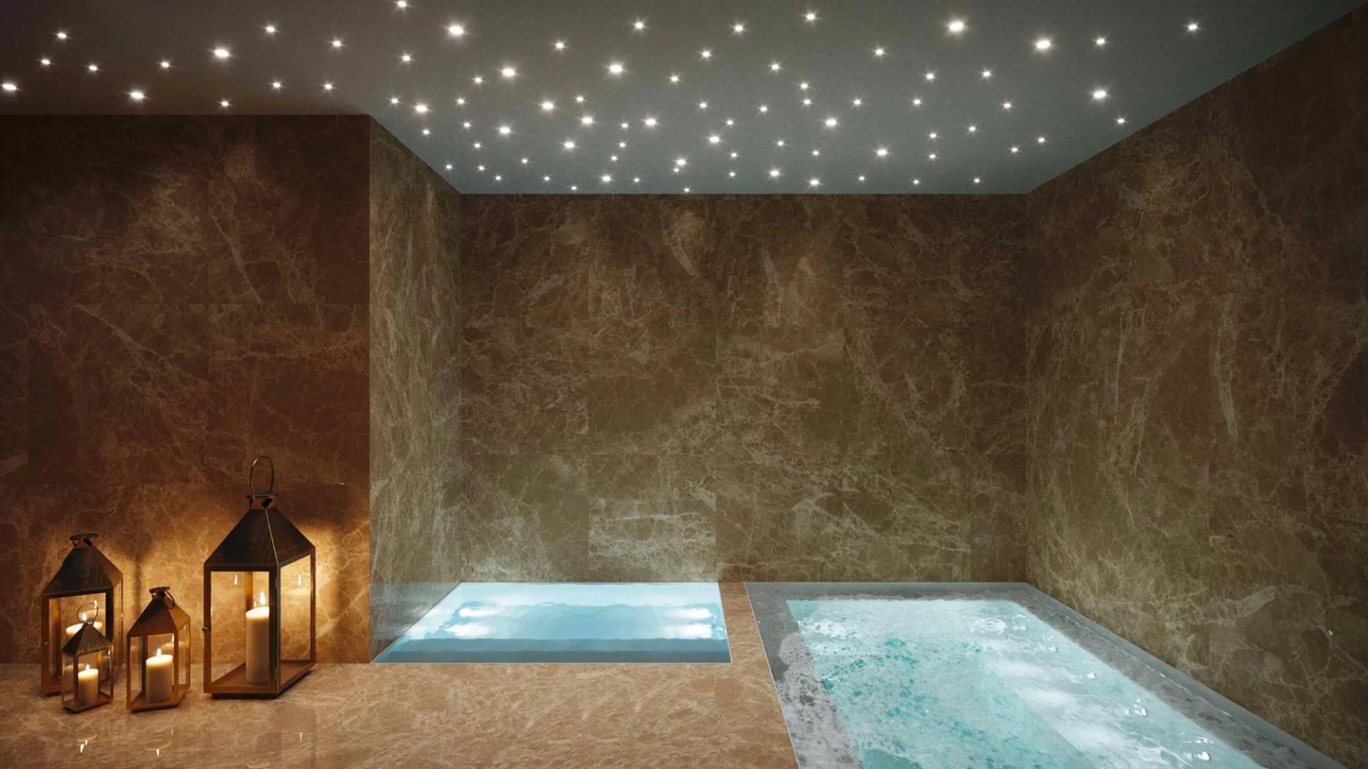 Les nouveaux propriétaires peuvent profiter d’une piscine intérieure avec sauna à vapeur et infrarouge ainsi que d’un jacuzzi, d’un pod froid, d’une salle de sport, d’une bodega, d’une salle de projection, d’une salle de jeux, d’une salle de massage, d’une salle de relaxation et d’une glam-room qui comprend un coiffeur et maquillage station.