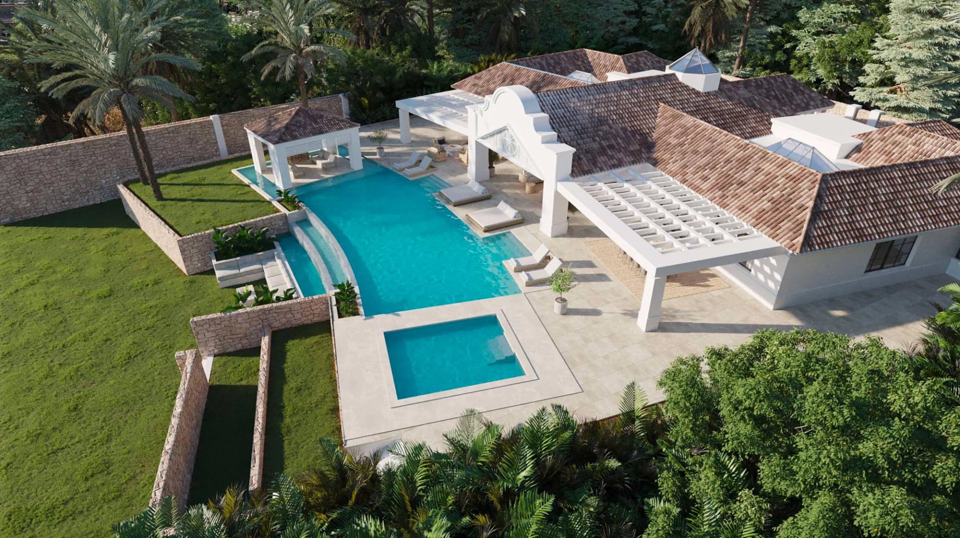 Les magnifiques terrains bien entretenus présentent un patio spacieux avec piscine à débordement, groupe de sièges flottants et pool house.