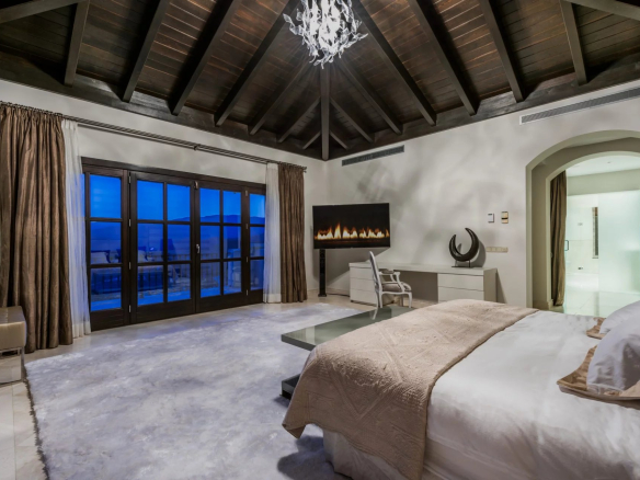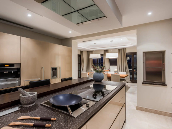 La villa est divisée en quatre niveaux, tous reliés par un ascenseur. Offrant cinq chambres, six salles de bain, des finitions haut de gamme et un magnifique décor personnalisé. Au rez-de-chaussée, on retrouve l’espace de vie principal, qui comprend un salon cosy avec cheminée. De plus, une salle à manger stratégiquement située dans la tour pour les meilleures vues et une cuisine spacieuse avec des appareils haut de gamme. Un autre espace de socialisation, ainsi que deux suites d’invités. De plus, ce niveau dispose d’une magnifique terrasse avec une fontaine à eau et est partiellement couverte pour profiter d’un dîner en plein air.