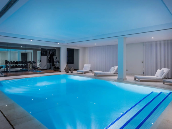 La chambre principale, avec un dressing et un patio privé, est située au premier niveau. Une chambre d’amis supplémentaire peut également être trouvée ici. Le niveau de la piscine est désigné comme la zone de divertissement de la propriété, avec une piscine intérieure chauffée, une salle de sport, un sauna et également un hammam turc d’un côté. Il y a aussi une cave à vin, un cinéma maison, une table de billard, un bar et enfin une cuisine de service. De plus, un espace séparé pourrait être utilisé comme appartement pour le personnel. Le sous-sol peut accueillir jusqu’à 6 gros véhicules, et la salle des machines offre beaucoup d’espace de rangement supplémentaire.