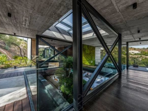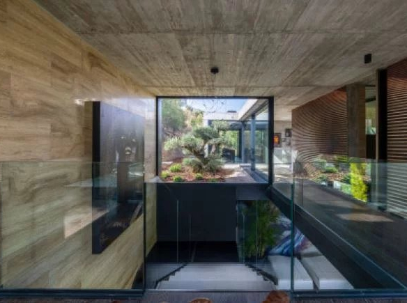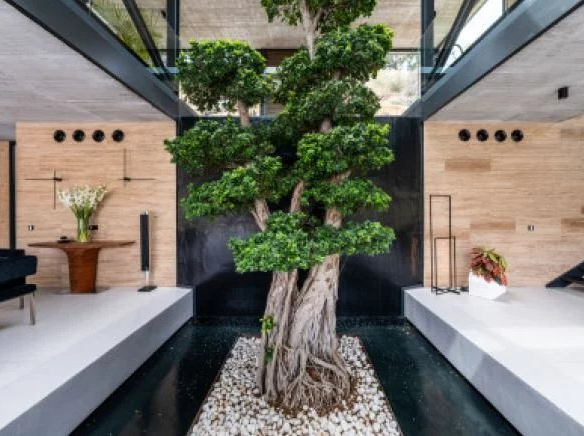 Un magnifique bonsaï ficus de 20 pieds de haut se dresse sereinement dans une piscine réfléchissante, engagé de manière ludique avec une cascade et la lumière du soleil filtrée par un plafond de verre au-dessus. L’influence des légendes architecturales Frank Lloyd Wright et Mies van der Rohe est évidente dans la conception, avec la Casa Flotante semblant flotter sur plusieurs plans d’eau qui traversent gracieusement la maison.