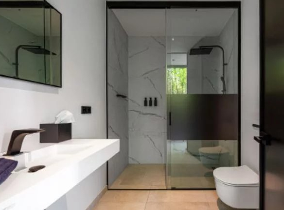 L’espace douche de la suite est tout simplement spectaculaire, doté d’un plafond de verre rétractable pour un bain de minuit unique sous les étoiles. Les luxueux accessoires Noken en bronze ajoutent à l’opulence du design linéaire moderne.