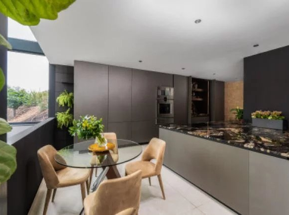 La cuisine italienne Modulnova de style minimaliste est entièrement équipée d’appareils Gaggenau et Smeg et dispose d’un robinet d’eau unique Quooker CUBE fournissant de l’eau bouillante, chaude, froide, filtrée et gazeuse. La cuisine américaine se connecte à une élégante salle à manger et à une terrasse pour des repas en plein air.