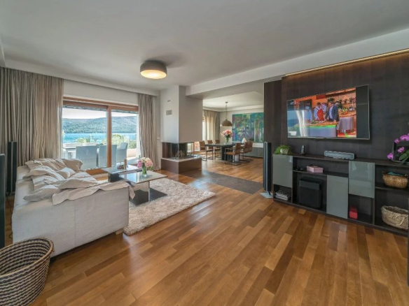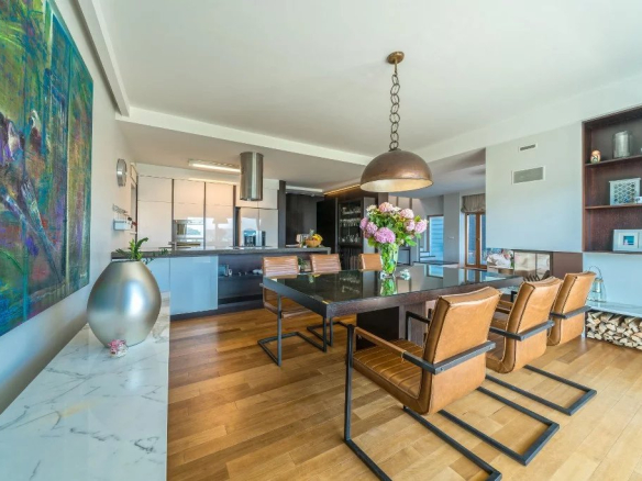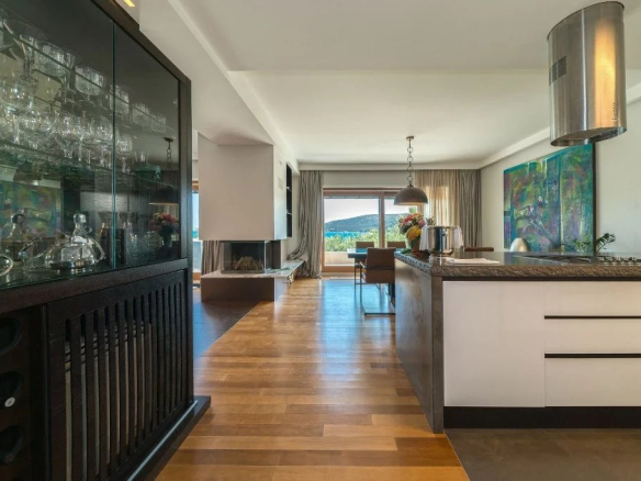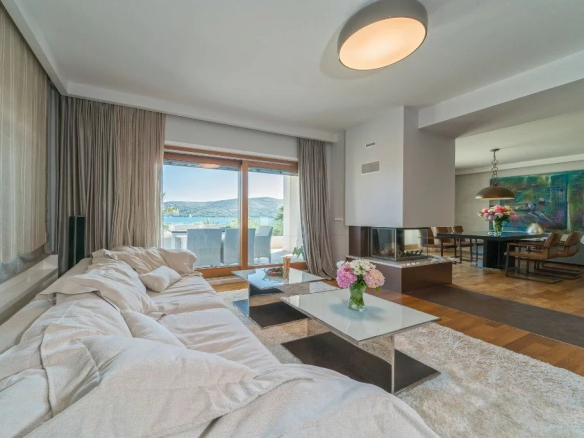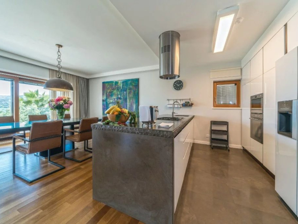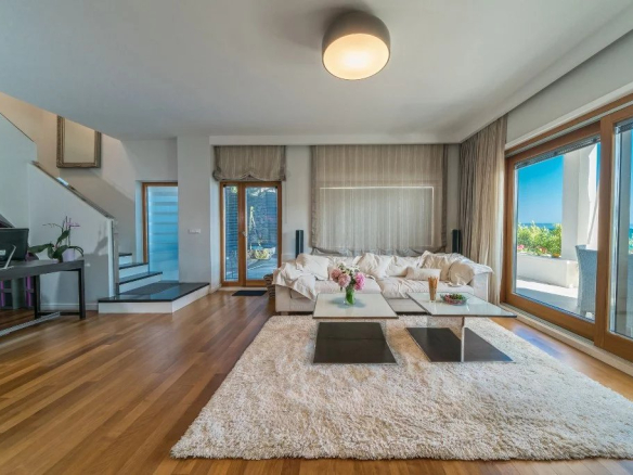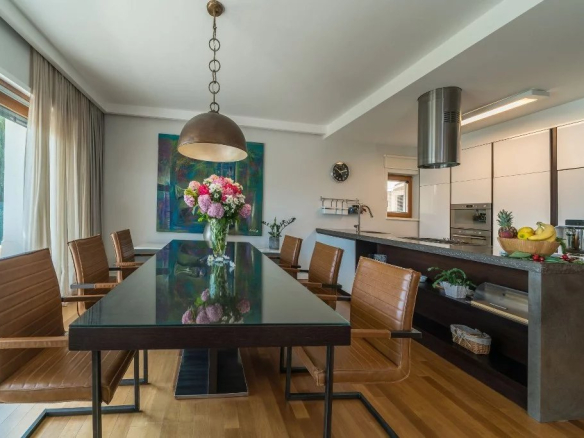 Le premier étage de la villa comprend une cuisine moderne équipée et une salle à manger, un espace avec une cheminée qui rayonne une atmosphère familiale chaleureuse dans cet espace, tandis que dans la deuxième partie se trouve un salon spacieux et confortable avec un grand canapé et une télévision LCD. En face du salon est un coin où vous pouvez consacrer à votre travail ou à votre lecture.