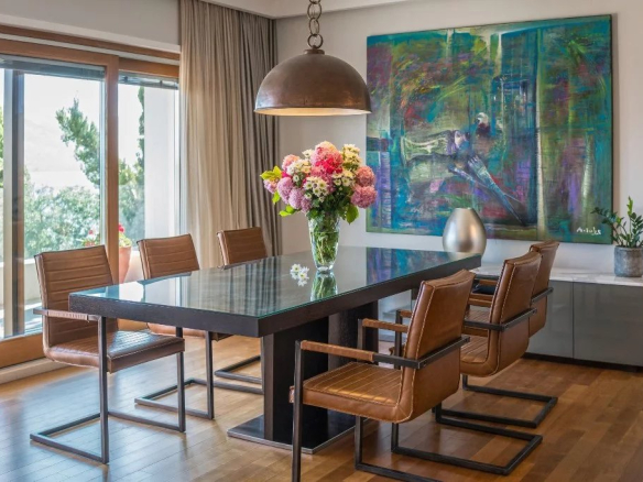 La longue terrasse du premier étage offre une vue magnifique sur le jeu romantique de l’horizon et du coucher du soleil, pendant que vous dînez ou savourez un verre de vin.