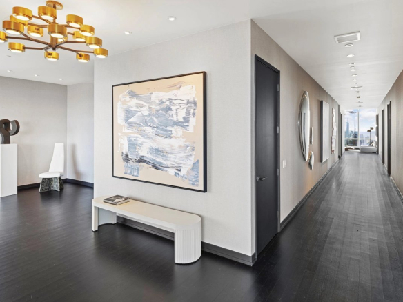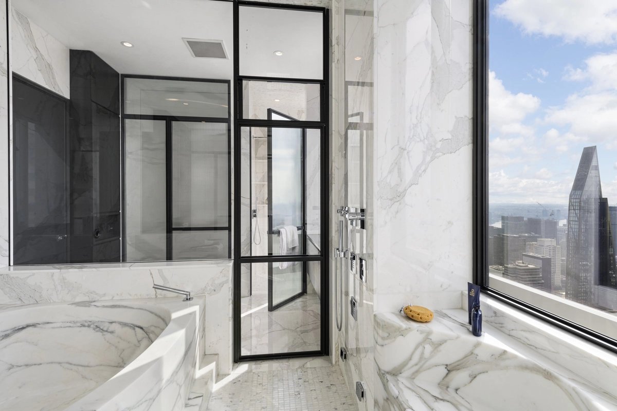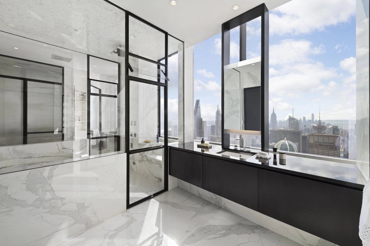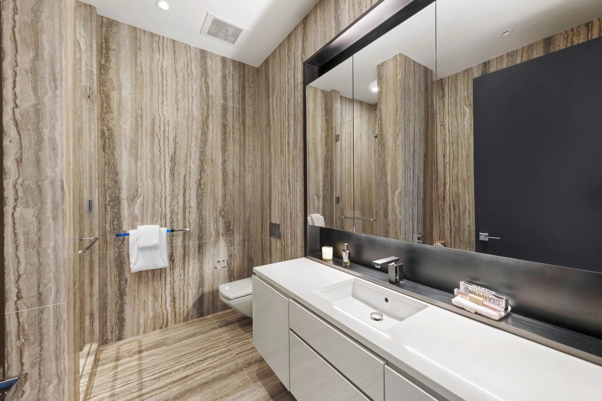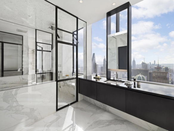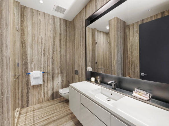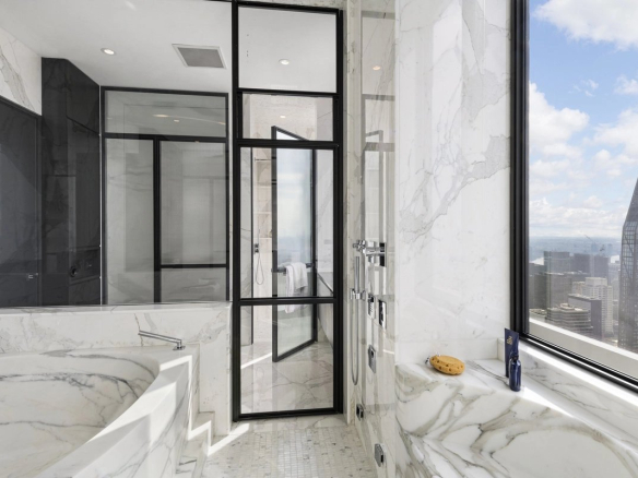 Une élégante galerie mène à la suite principale ainsi qu’aux 3 chambres supplémentaires, chacune avec une salle de bain entièrement revêtue d’onyx, de marbre ou de travertin, un chauffage au sol radiant et des luminaires Dornbracht. La suite principale comprend un immense dressing et une salle de bains avec deux vasques, deux toilettes et deux douches en marbre Statuario italien et avec des accessoires Dornbracht. La salle de bain principale dispose également d’une salle d’eau avec une baignoire et une douche à vapeur en marbre sculpté Waterworks. La chambre principale a des expositions nord, sud et est qui offrent des vues incroyables toute la journée.