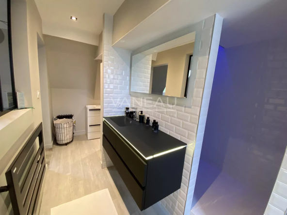 À l’étage, quatre chambres dont une suite rénovée, trois salles d’eau élégantes : tout ici respire le bien-être et la sérénité.