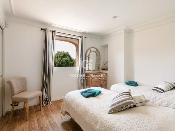 À l’étage, deux chambres supplémentaires — dont une avec terrasse tropézienne — se partagent une salle de bains et des toilettes indépendantes.