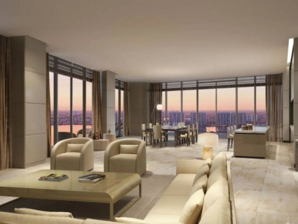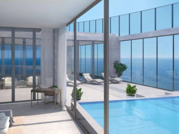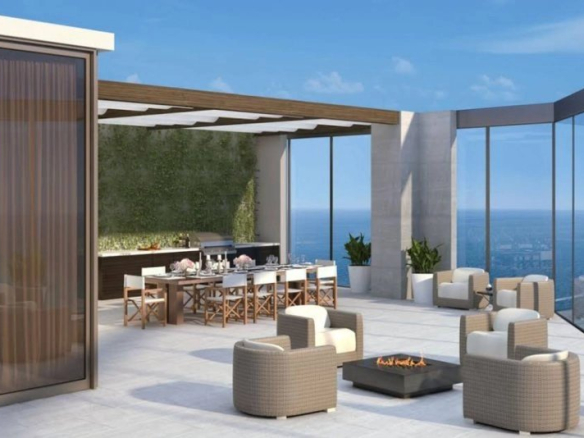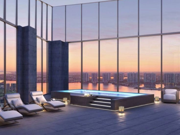 Mis à part les penthouse,le bâtiment est une tour de verre contemporaine avec des fenêtres du sol au plafond. Le nouveau penthouse en duplex situé au cœur de Miami est à l’origine du design intérieur du projet de luxe, qui utilise des textiles riches dans une palette de tons doux et dramatiques pour créer une «atmosphère de sophistication intemporelle dans le hall et les espaces communs. Les maisons disposent de fenêtres du sol au plafond pour profiter des vues incomparables couvrant des kilomètres de sable blanc doux et d’eau turquoise, tandis que les terrasses extérieures fonctionnent pour faire entrer l’extérieur.Plafonds de 7 mètres de haut, bassin profond, 55 et 56e étage, 510 m2.