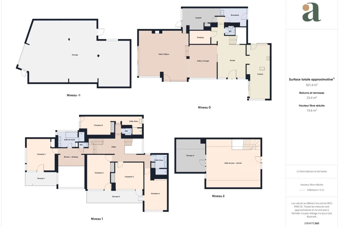 L’étage, pensé comme un cocon, offre cinq chambres, dont la plupart bénéficient d’un accès à une terrasse privative. La suite parentale, véritable appartement dans la maison, offre chambre, dressing, salle de bain avec douche et baignoire, et WC séparé. Une chambre d’amis dispose de sa propre salle d’eau et de toilettes, tandis qu’une salle d’eau supplémentaire complète cet étage.