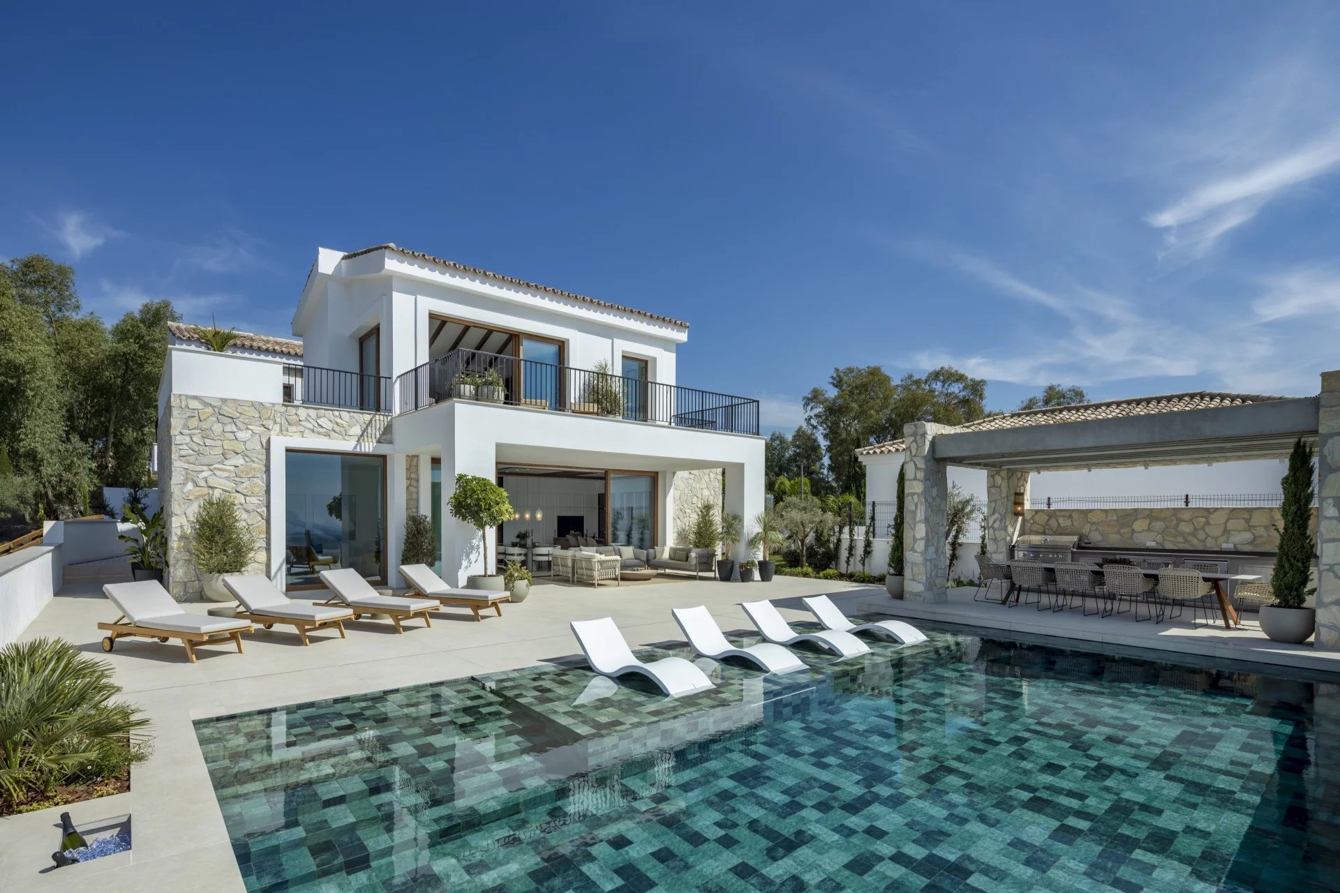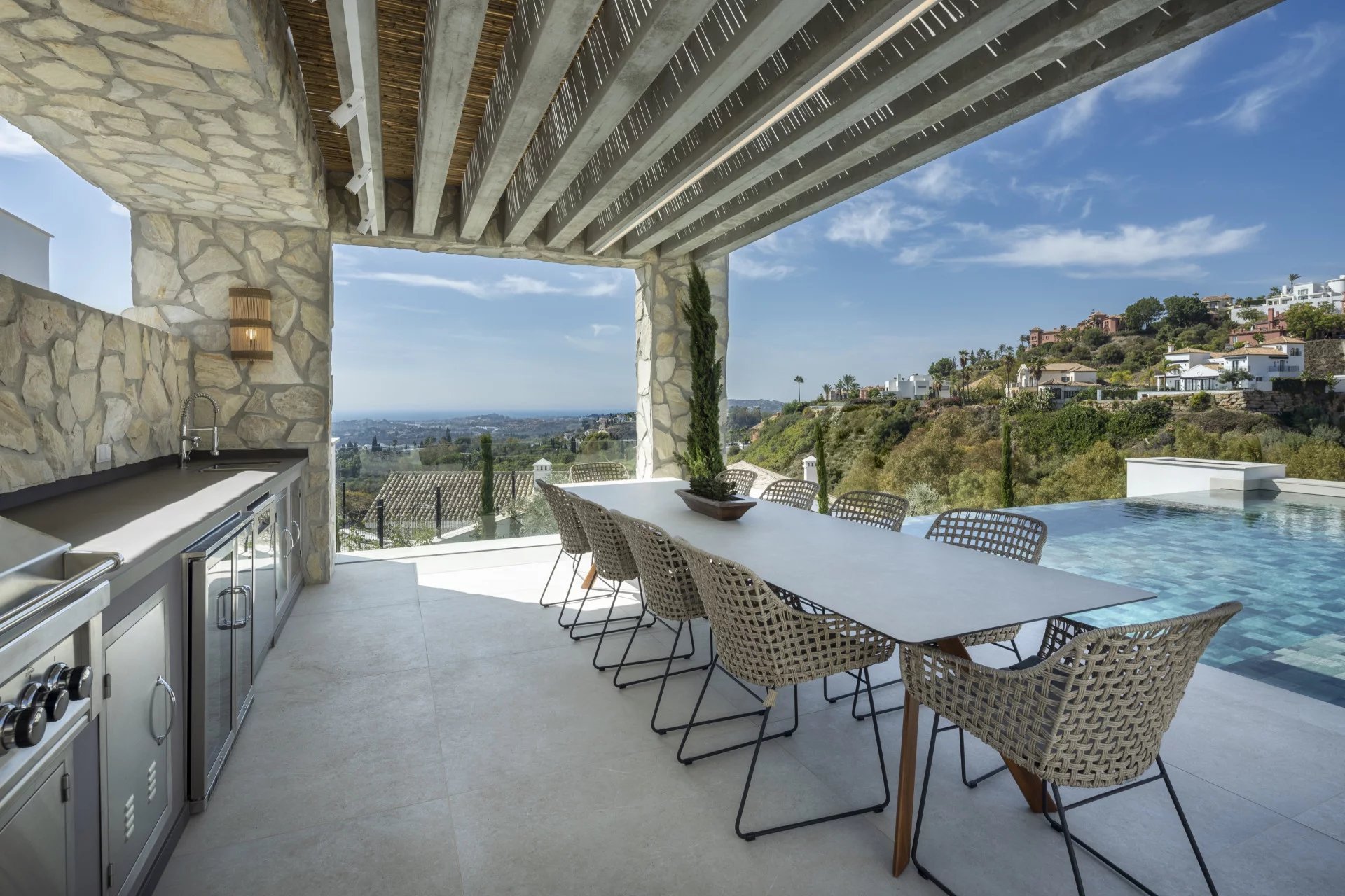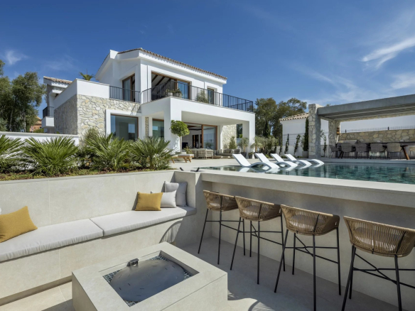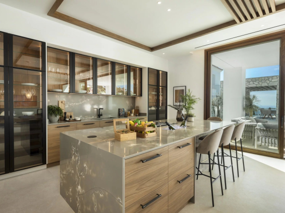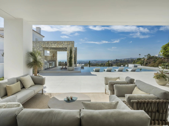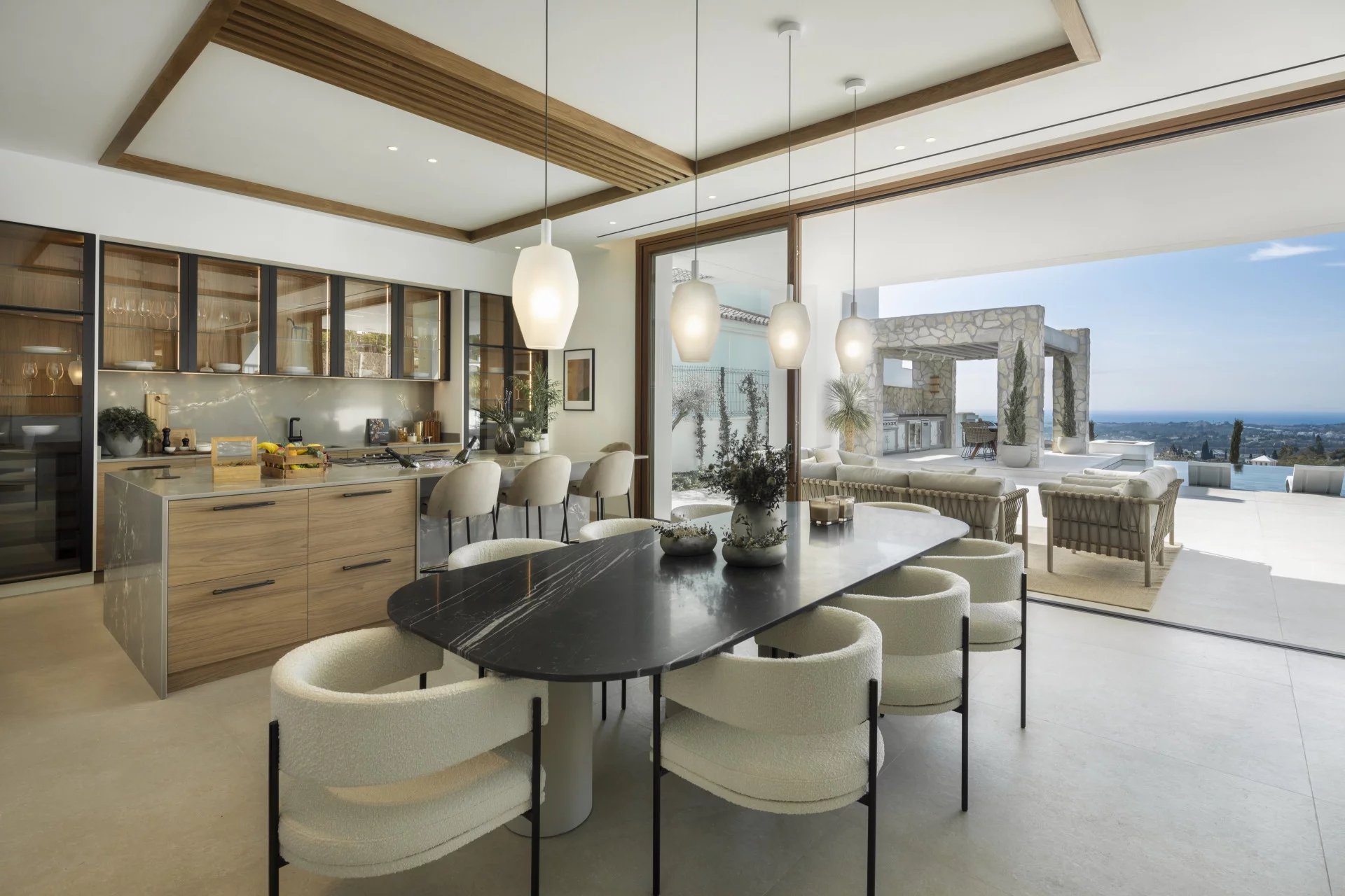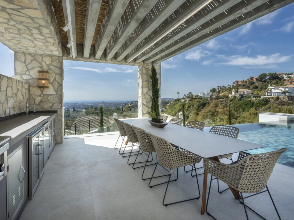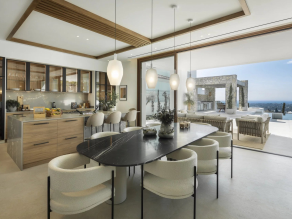 Les espaces extérieurs sont tout aussi impressionnants, avec de grandes terrasses offrant une vie intérieure/extérieure idéale, ainsi que plusieurs coins salons pour manger en plein air et se détendre tout en profitant du beau climat méditerranéen et de la vue sur la mer.