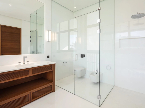 Le niveau inférieur comprend les autres chambres, le salon et la cuisine, un mélange harmonieux de fonctionnalité et de style. L’ensemble du rez-de-chaussée s’ouvre sans effort sur le jardin, accueillant l’air frais et la lumière naturelle dans la propriété.