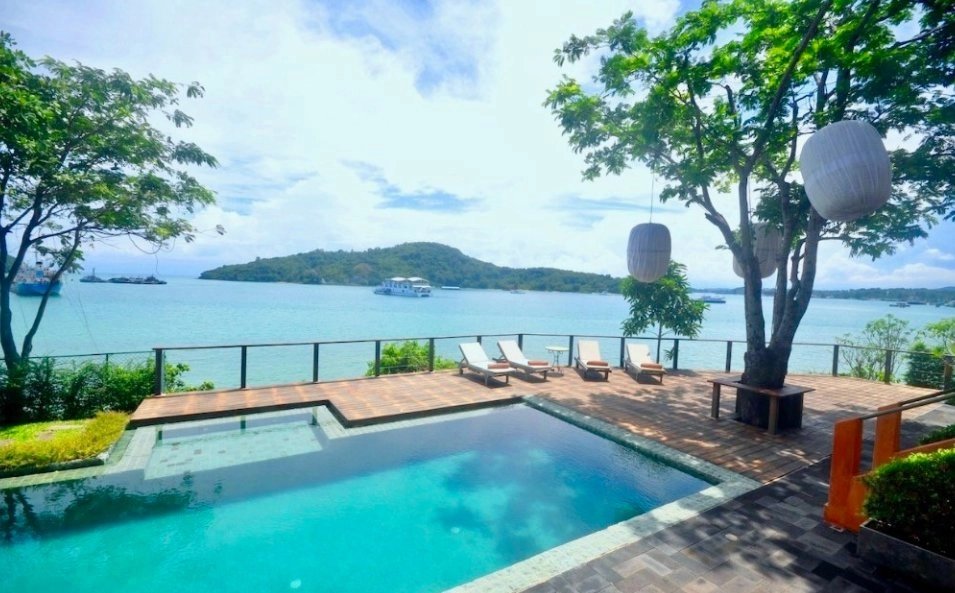 La terrasse dispose de plusieurs sièges et zones de divertissement pour les fêtes à côté de la piscine et offre une vue magnifique sur la mer et les îles.
