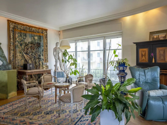 La réception en rotonde, le parquet en point de Hongrie et les majestueuses colonnes ajoutent une touche de prestige à ce appartement de grand standing.
