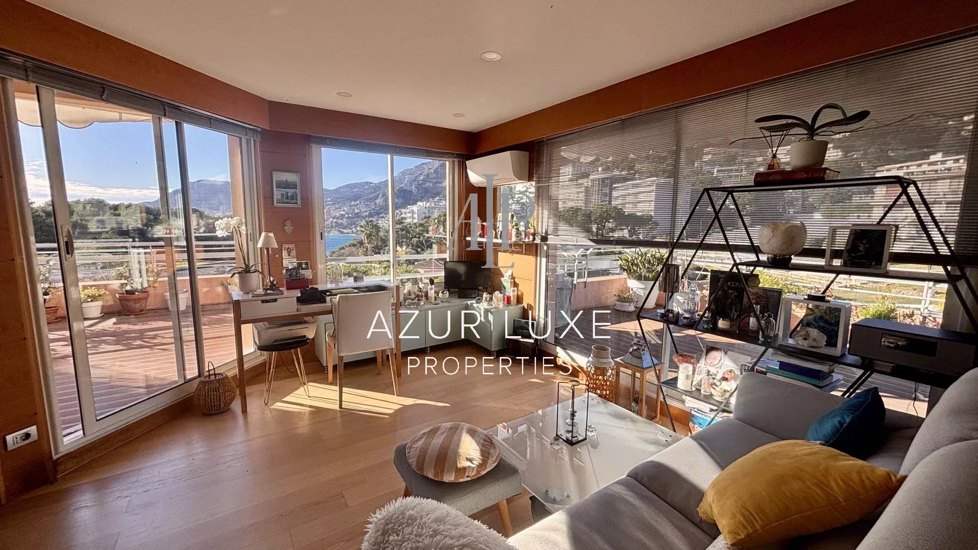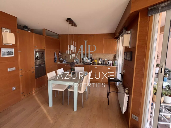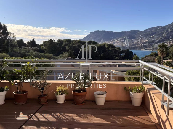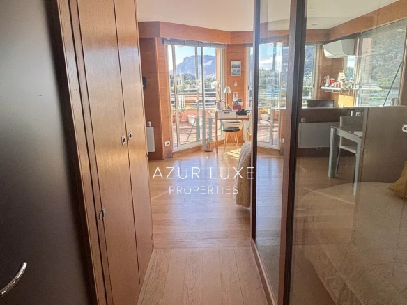 Il se compose d’un beau séjour, avec cuisine ouverte entièrement équipée, dotée de mobilier sur mesure de grande qualité. L’espace de vie s’ouvre sur deux terrasses, offrant une vue exceptionnelle sur la mer et la Principauté de Monaco.