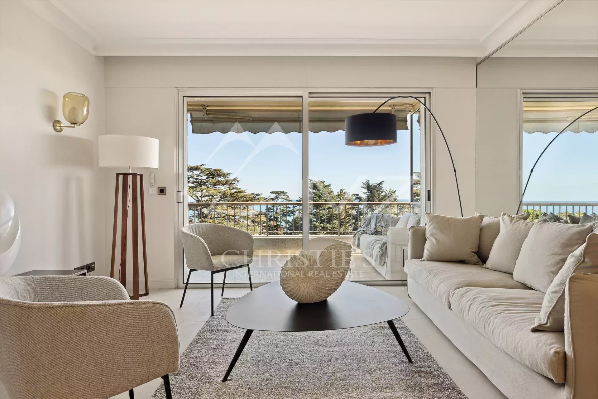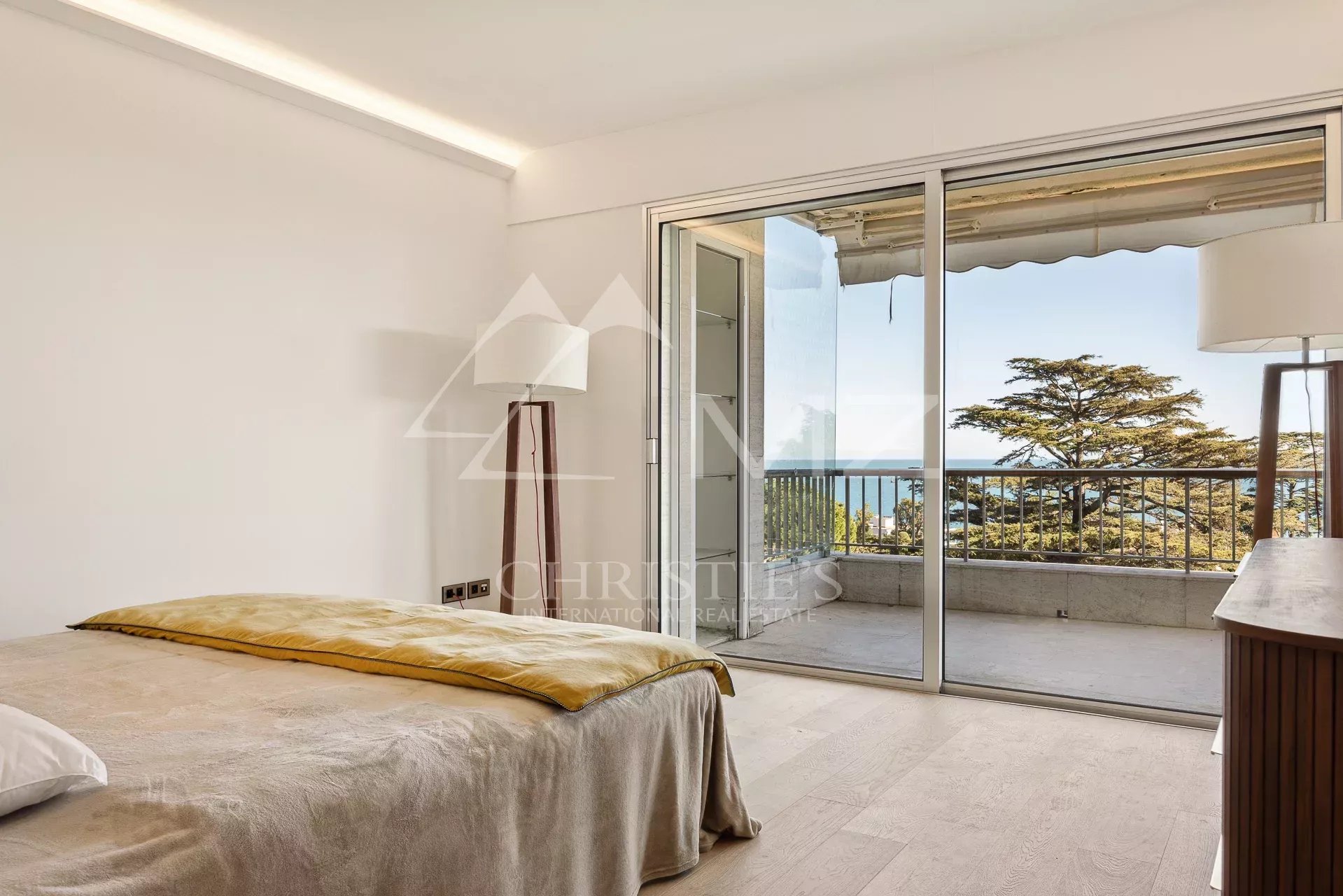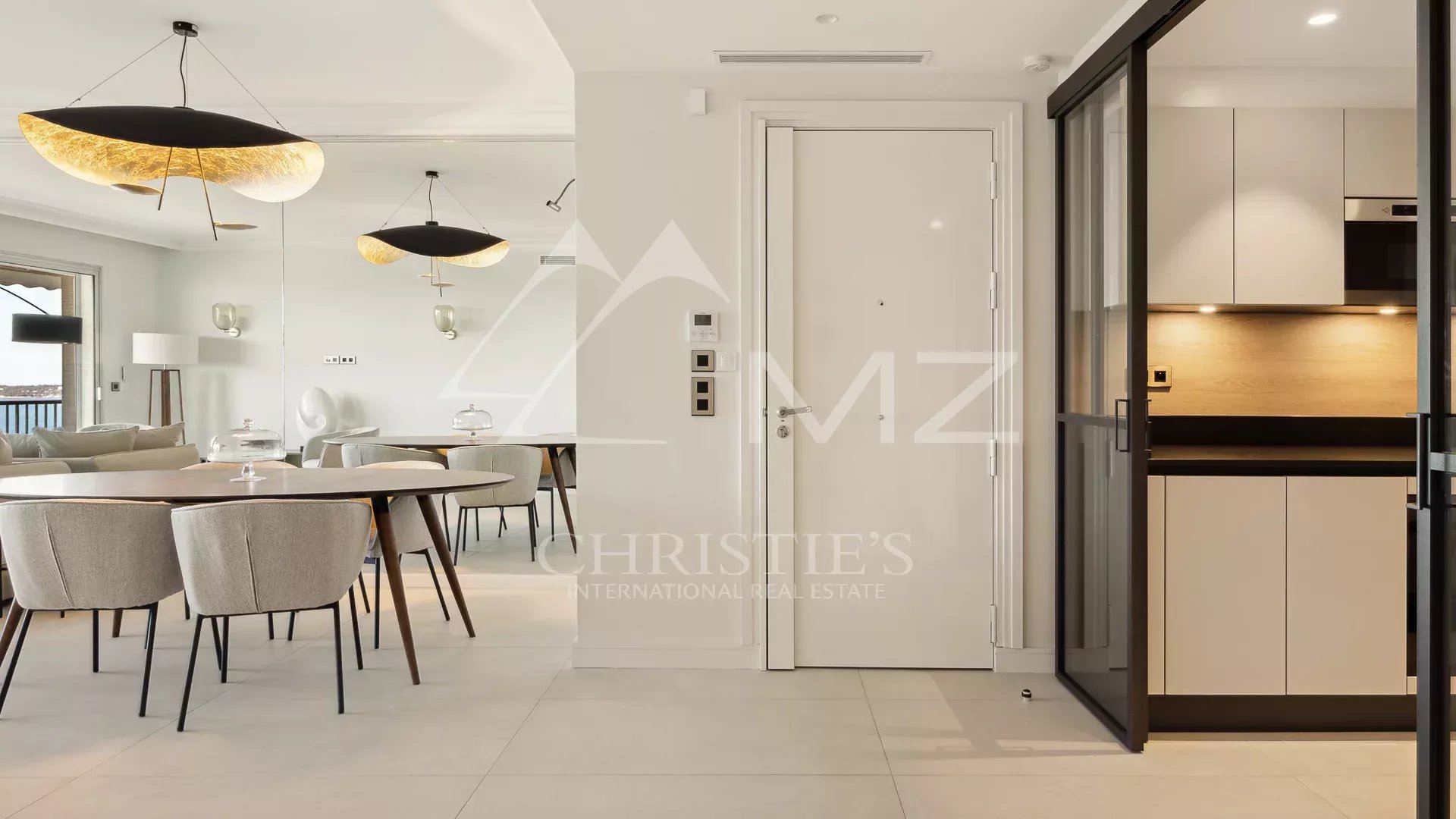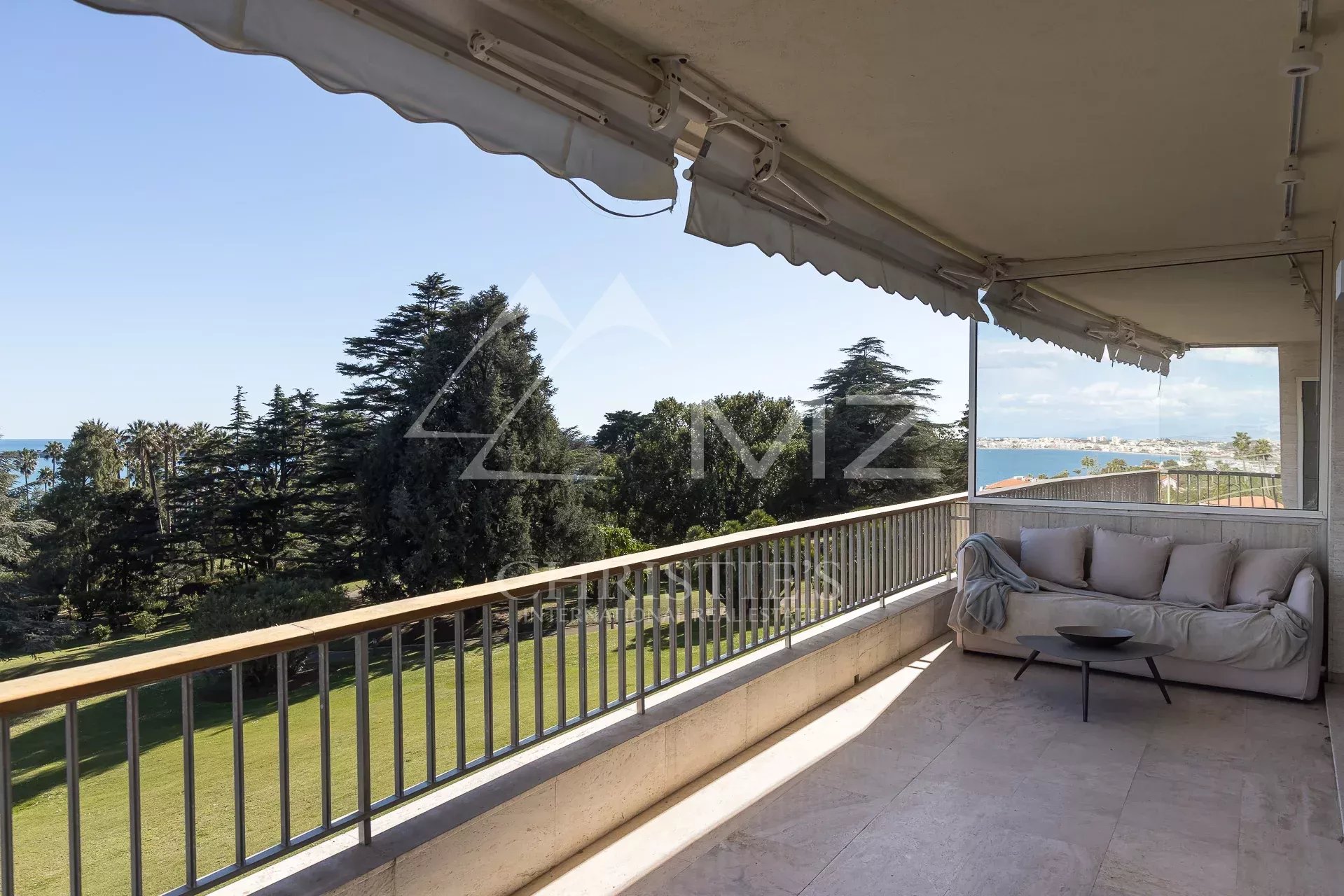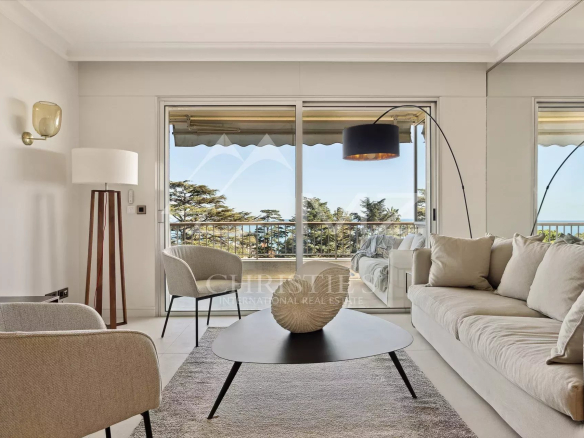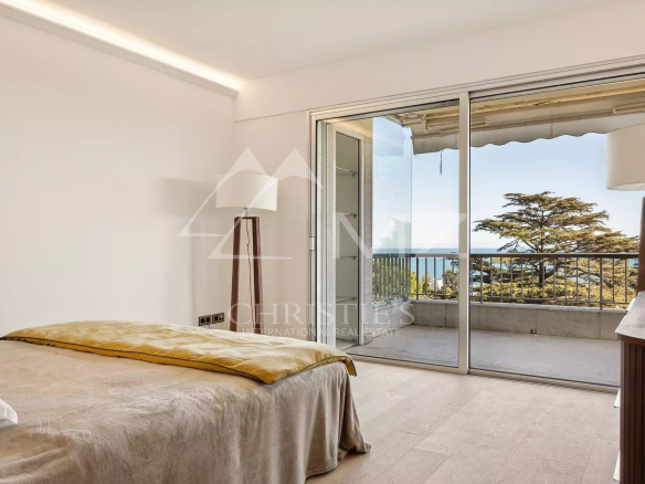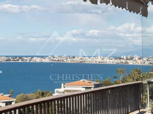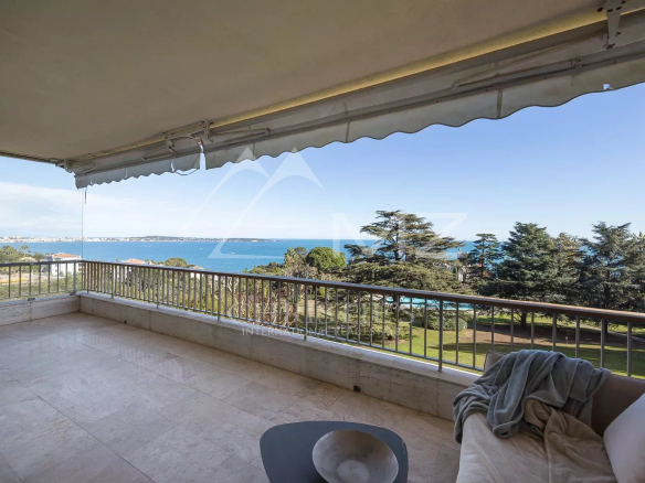 L’appartement, lumineux et luxueux, bénéficie d’une vue panoramique sur la mer et le Cap d’Antibes. La cuisine semi-ouverte est équipée avec des matériaux de qualité et est en excellent état. Les chambres disposent de parquet et la terrasse offre un bel espace extérieur pour profiter de la vue.