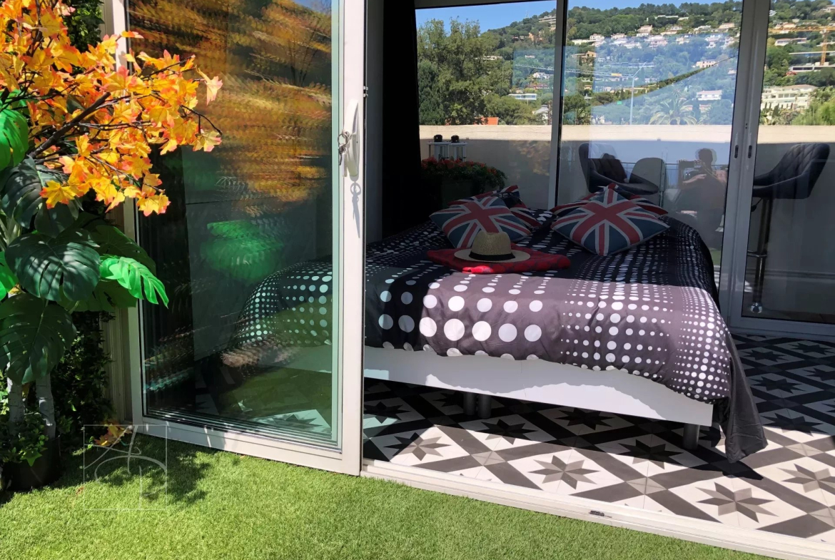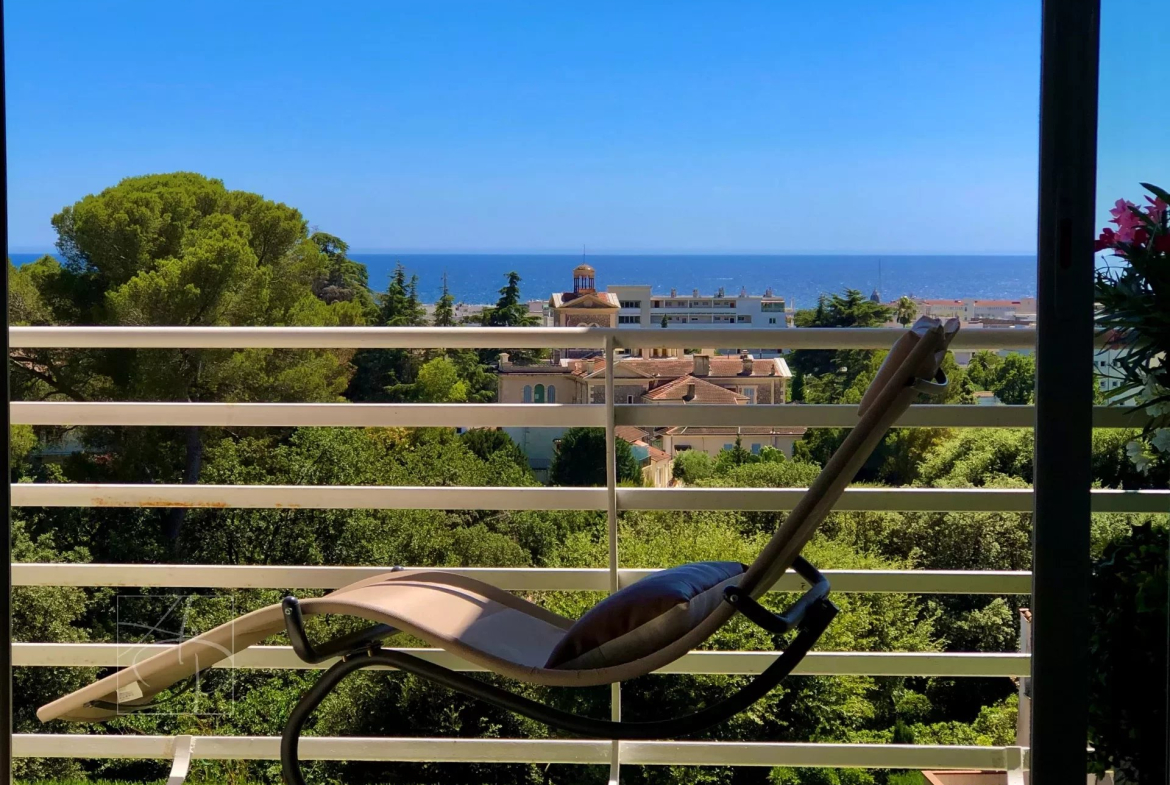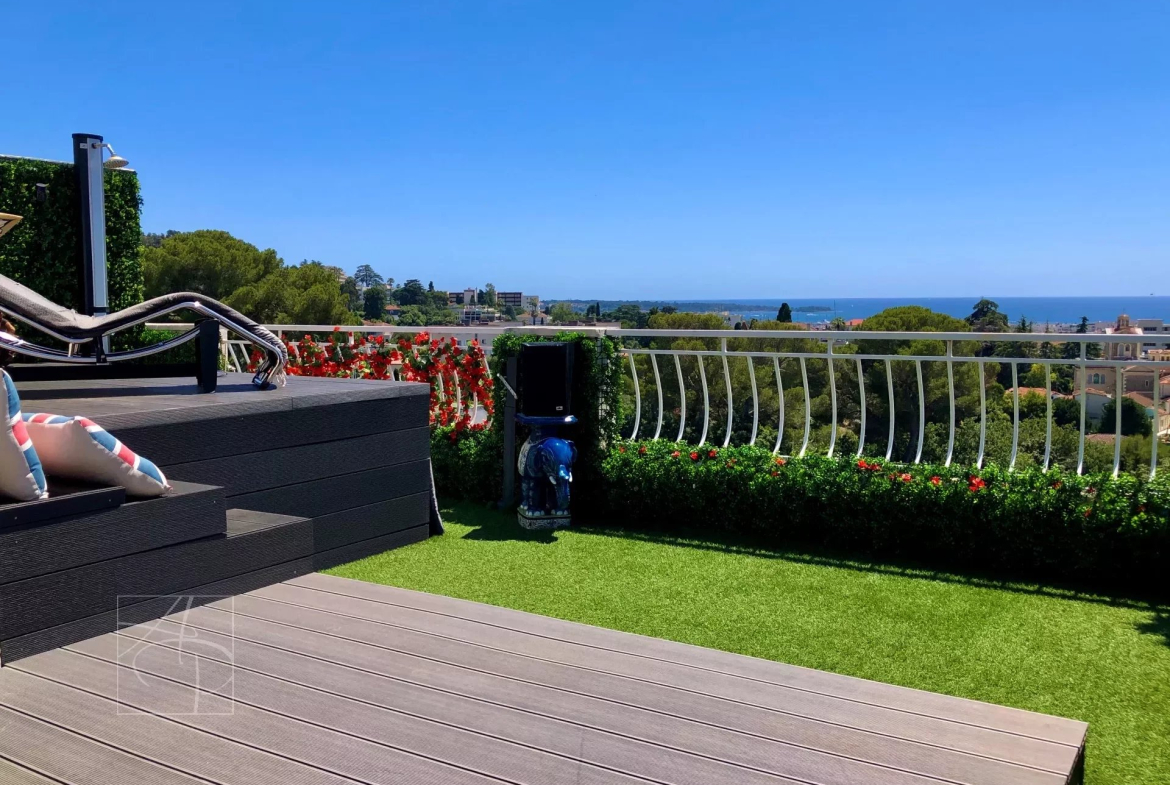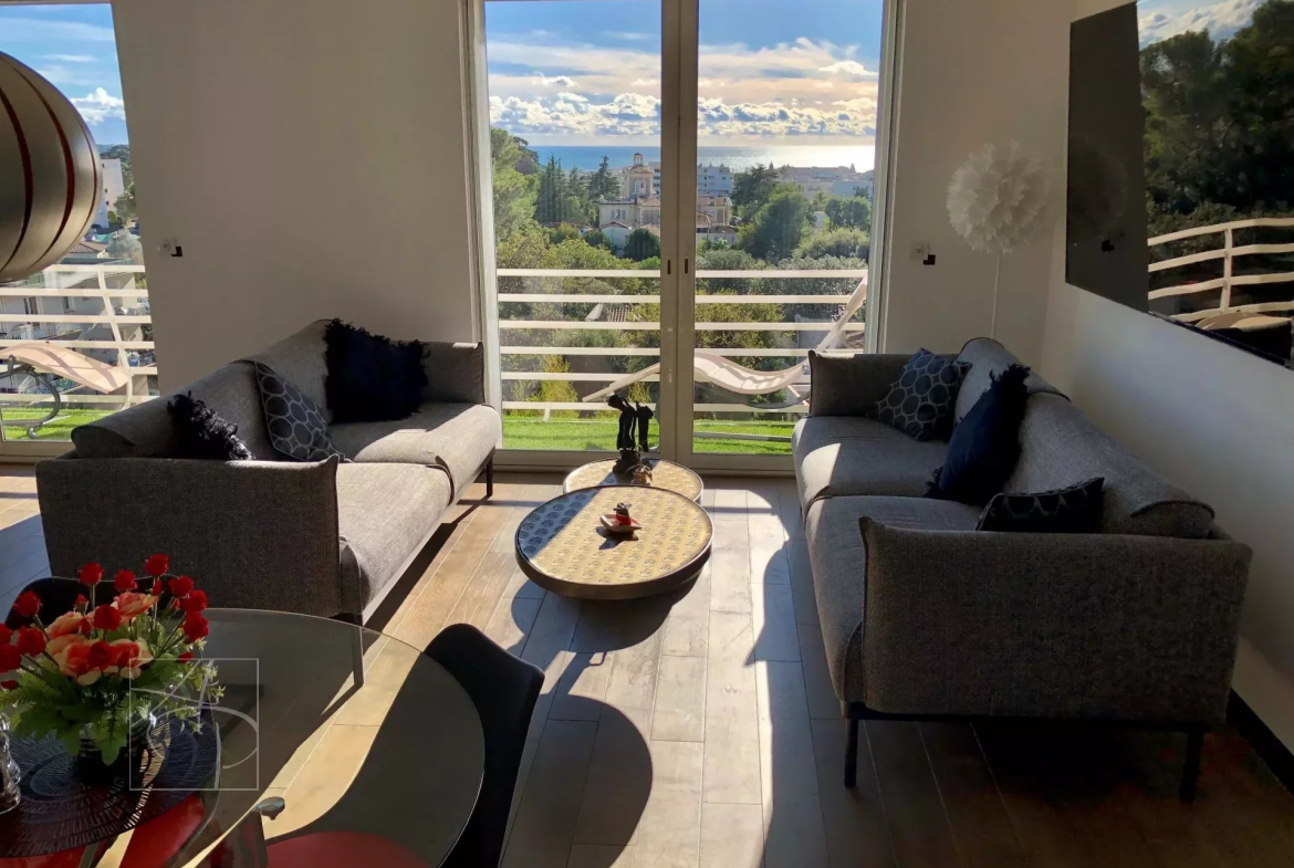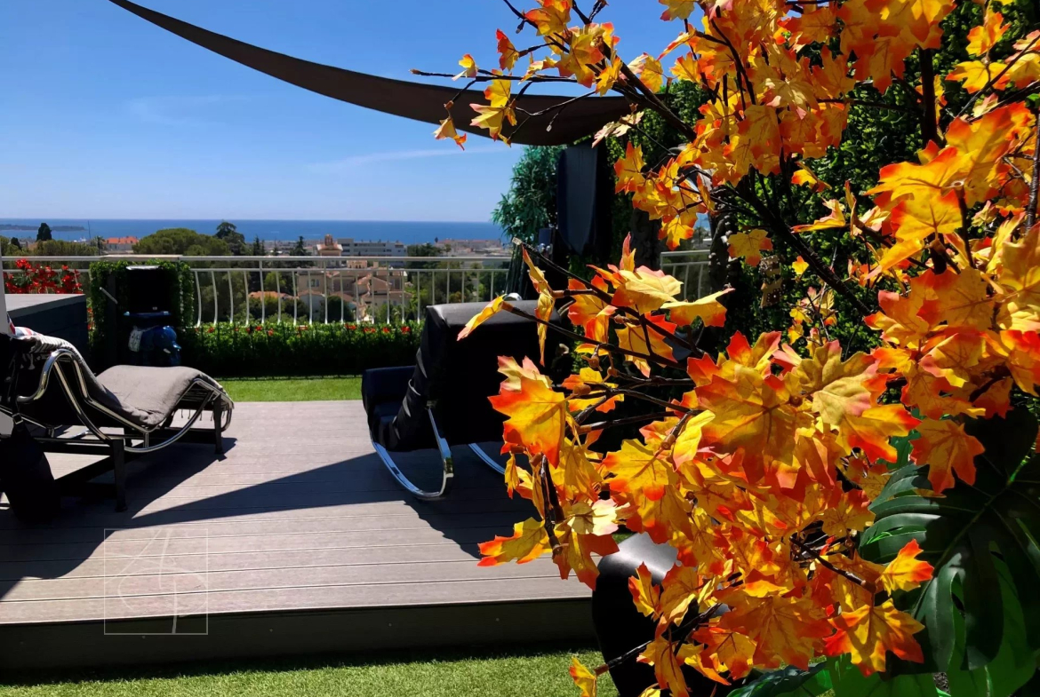 Dans le secteur Montfleury Isola Bella appartement 2-3 pièces en villa sur le toit avec vue mer panoramique. Coup de coeur assuré pour ce charmant appartement de 45.43 m2 loi carrez entièrement rénové dans une petite copropriété dans la verdure, au calme absolu et à 10 minutes environ du centre ville à pied. L’appartement se compose d’une cuisine entièrement équipée ouverte sur le séjour, exposé plein sud et donnant sur un balcon terrasse vue mer panoramique, une chambre plein sud également offre une jolie vue jusqu’à l’Esterel , une salle de douche et un wc indépendant complète cet appartement ultra lumineux et dont toutes les pièces sont ouvertes sur un extérieur. De plus, à l’étage une superbe terrasse sur le toit vue mer panoramique de 48m2 , véranda fermée avec une chambre, une salle de douche avec wc et coin kitchnette. Produit atypique et plein de charme pour les amoureux du calme , de la vue mer et parc tout en étant à proximité du centre ville. L’appartement est vendu avec une grande cave d’environ 11 m2 au sous sol accès direct depuis l’ascenseur .Stationnement dans la résidence fermée.