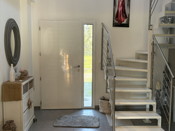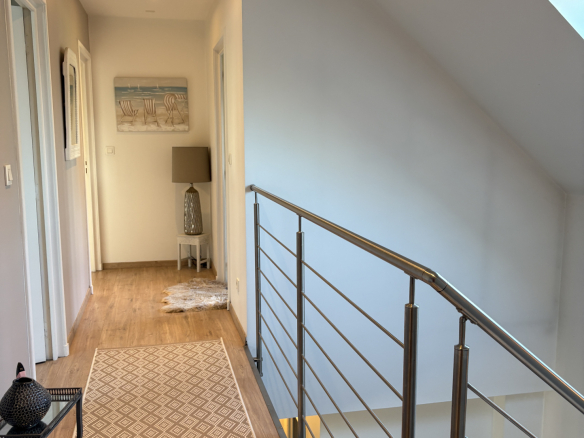 Elle comprend également au rdc, un hall d’entrée, un vestiaire, wc indépendant, un. cellier, deux chambres dont une suite parentale. donnant sur la terrasse. A l’étage, un couloir dessert deux chambres, une salle d’eau, wc indépendant.