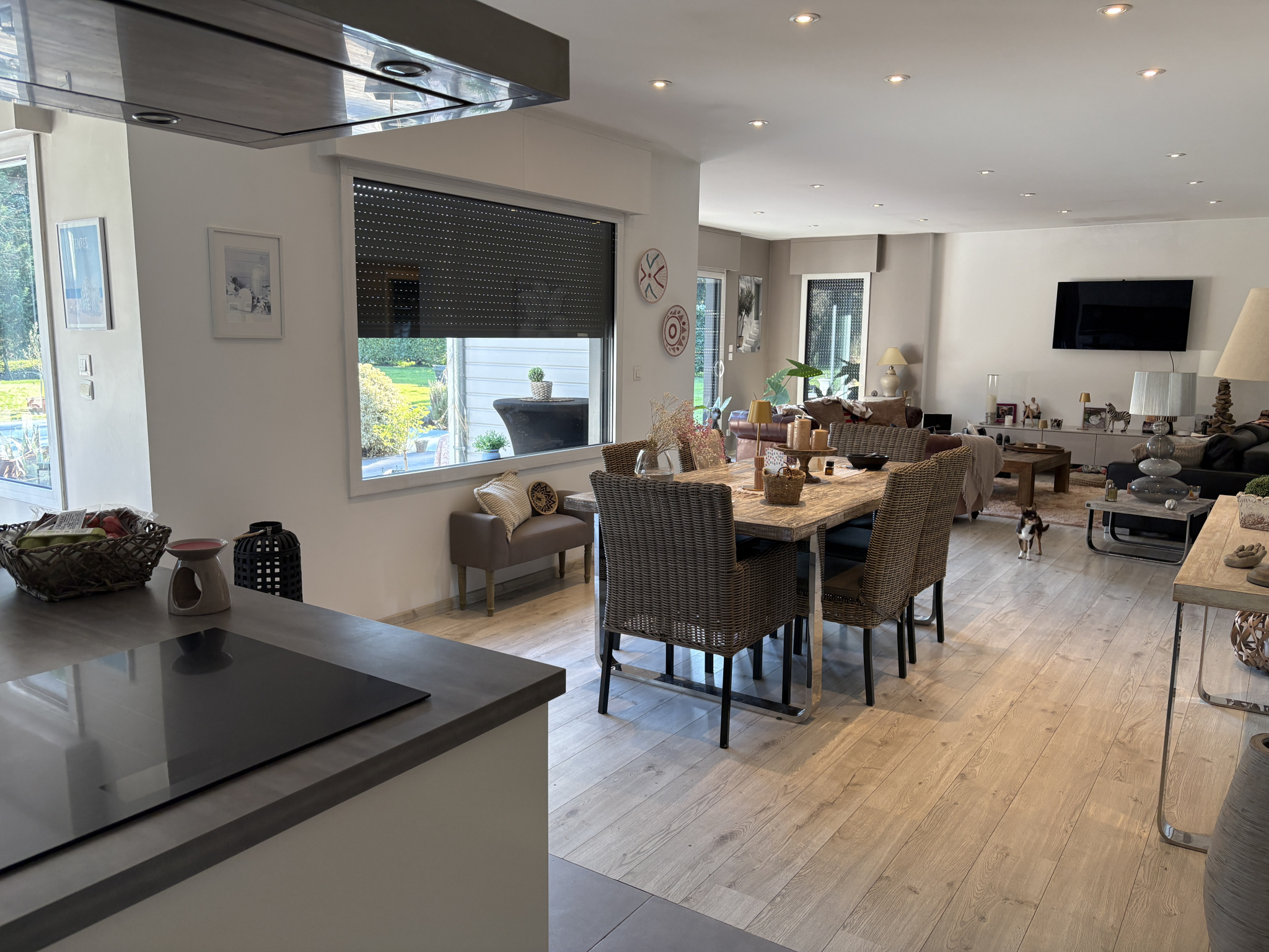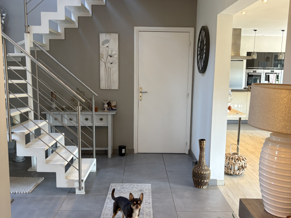Grâce à son garage de 36 m2 avec porte motorisée, et attenant à la maison, elle présente un atout supplémentaire, offrant des possibilités d’amenagement.