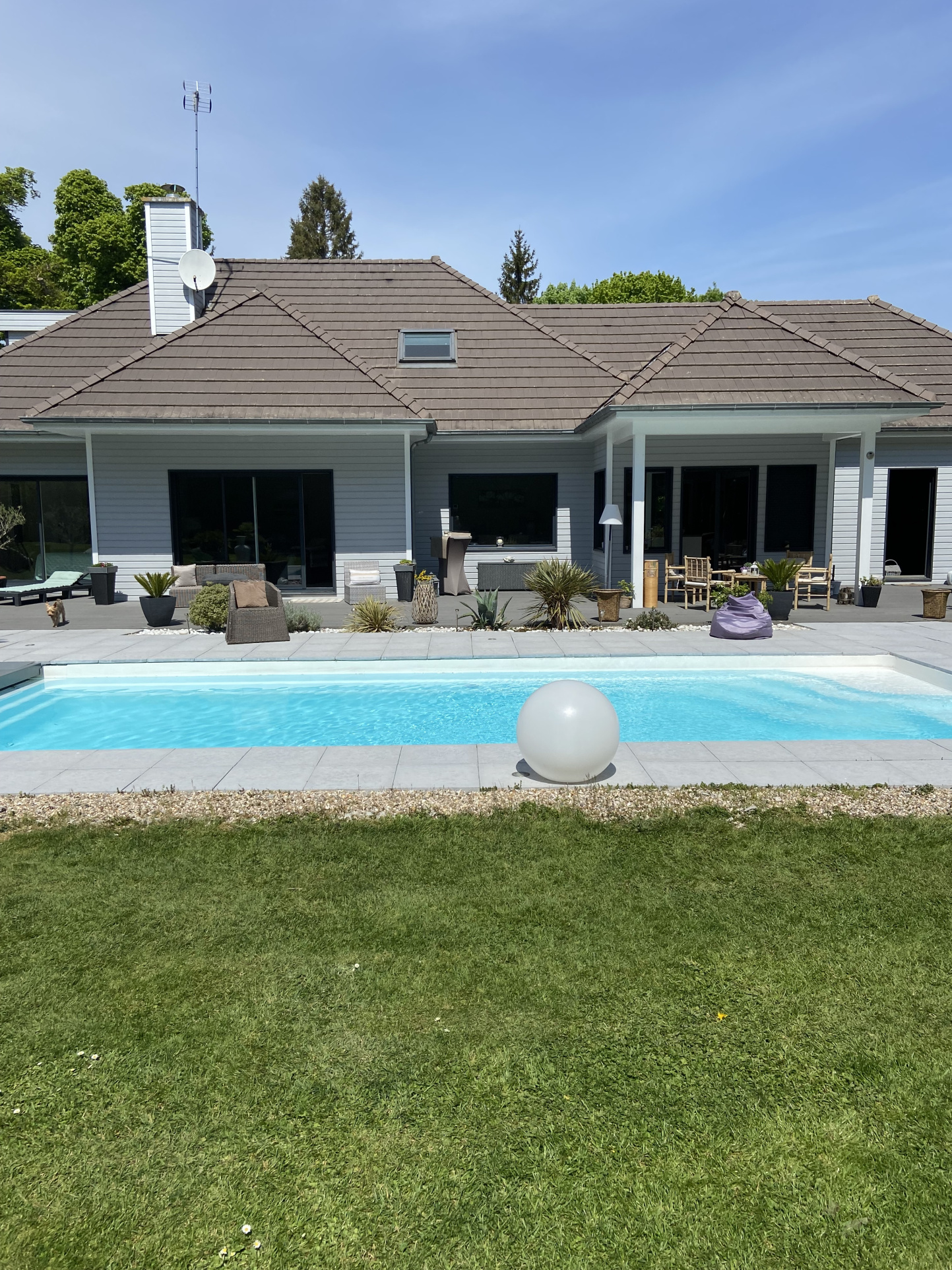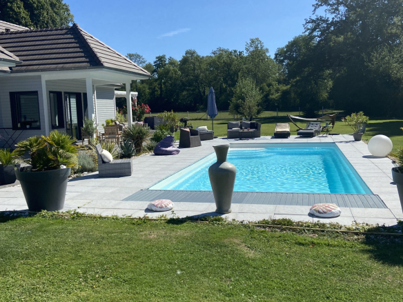 Elle s’organise principalement autour de la pièce de vie de 60 m2 environ, orientée vers la terrasse et sa piscine chauffée plein sud. Une seconde terrasse est conçue pour s’ abriter et prolonger les belles journées avec une vue dégagée sur la prairie et la forêt.