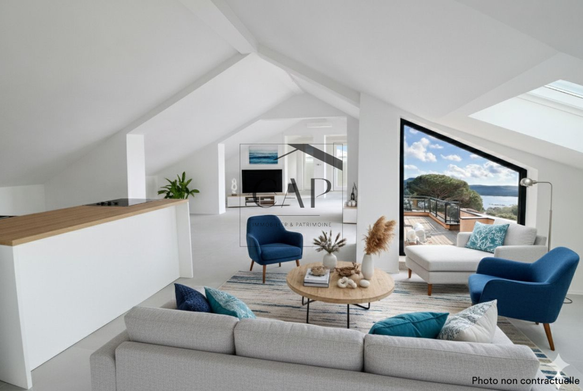 — English version — Exceptional 105 sqm top-floor apartment in a prestigious seaside residence with direct beach access. Nestled under the roof, it offers unique charm, generous volumes, and a bright 42 sqm living area with kitchen. The property features four bedrooms including a master suite, three bathrooms, ample storage, and a stunning 49 sqm terrace with open views over nature and the Corsican coastline. Fully renovated, air-conditioned, with three parking spaces and premium on-site amenities.