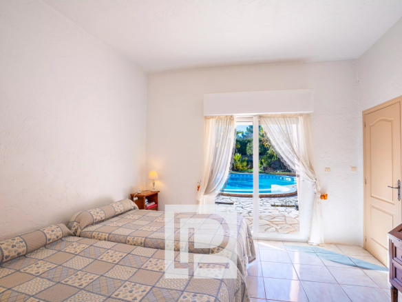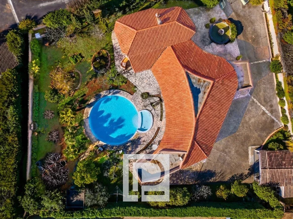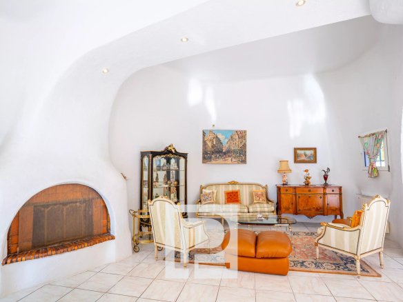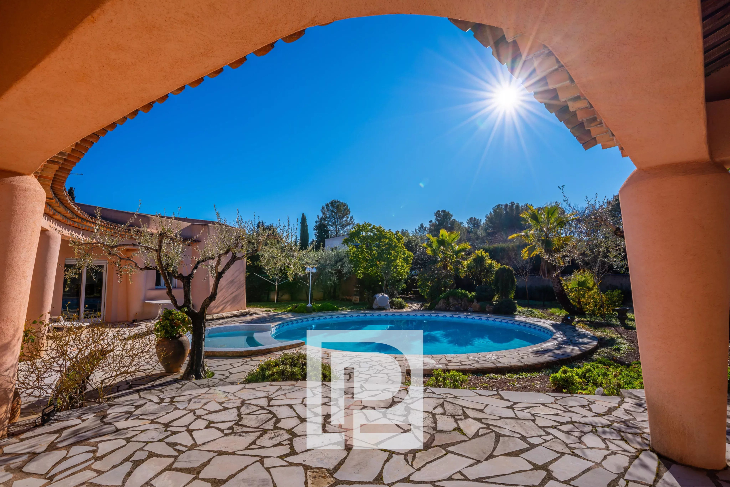 Exposée plein Sud et sans aucun vis à vis, la villa est érigée sur un magnifique terrain plat et paysagé de 1700m² complanté d’oliviers. Une piscine circulaire de 9 mètres de diamètre vient sublimer cet extérieur.