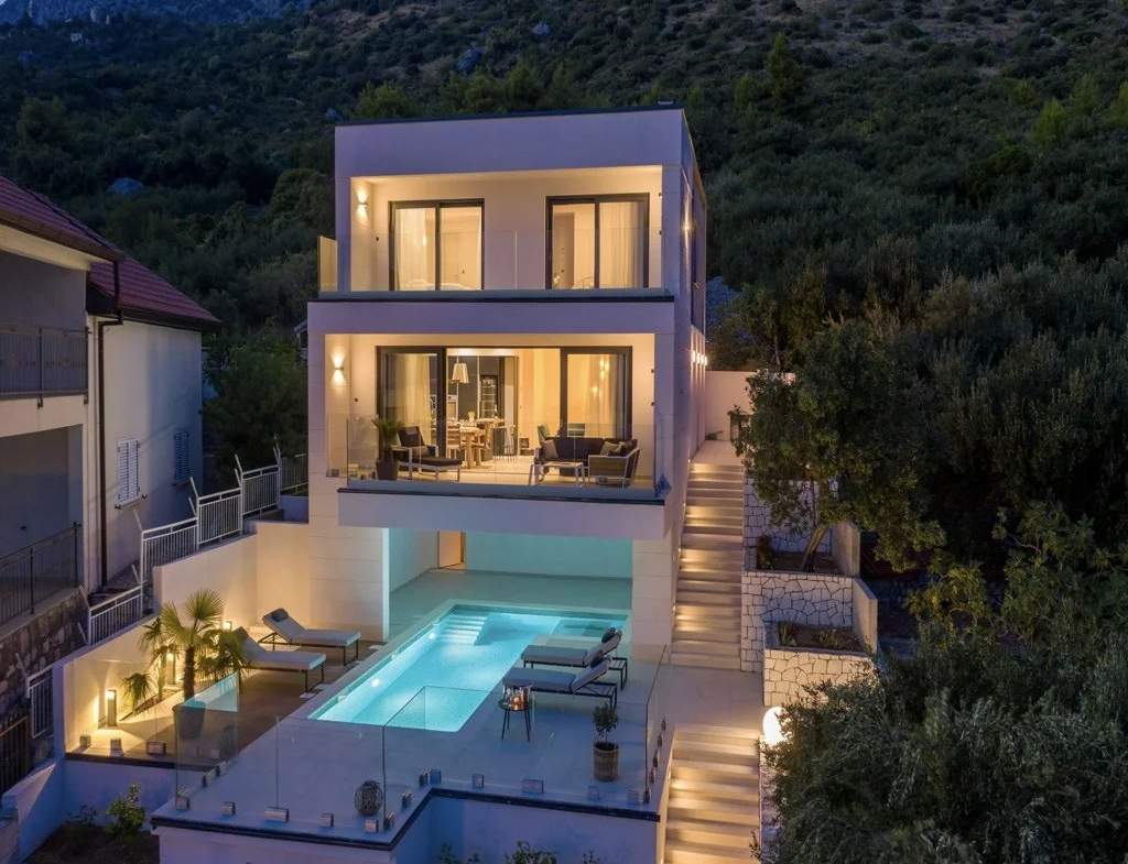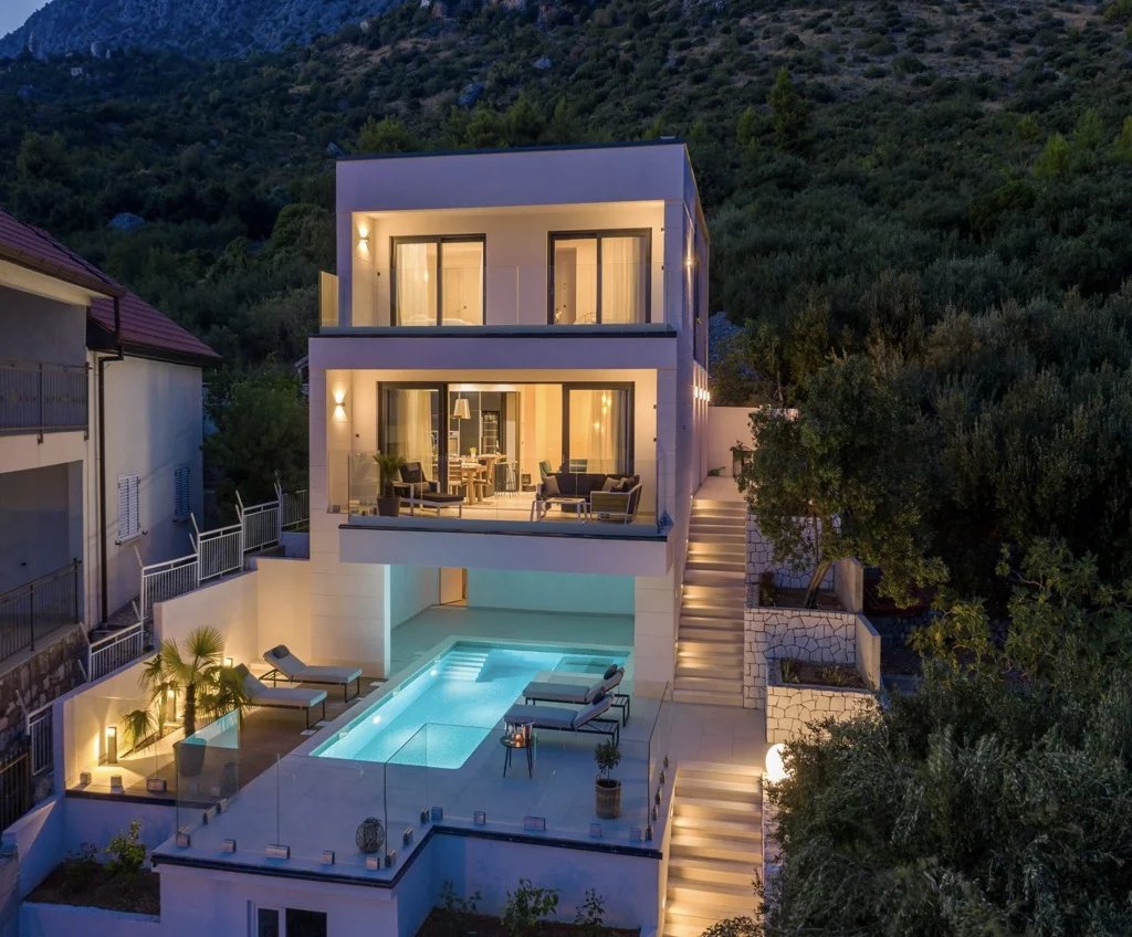 Au cœur de la Dalmatie, se trouve la Riviera de Makarska, l’une des destinations touristiques les plus connues de la côte croate ! En raison de ses caractéristiques naturelles et de son climat, de ses offres touristiques diversifiées et de ses hôtes hospitaliers, Makarska attire des visiteurs du monde entier ! Situé à environ 60 km au sud-est de Split et à 140 km au nord-ouest de Dubrovnik, dans le comté de Split-Dalmatie, c’est un important centre touristique régional, situé sur une baie sous les montagnes de Biokovo et la mer Adriatique, connue pour sa promenade bordée de palmiers, où cafés, des bars et des boutiques surplombent le port Makarska est le centre de la Riviera de Makarska, une destination touristique populaire sous la montagne Biokovo. Une merveilleuse combinaison d’une ville balnéaire cosmopolite, avec sa jolie promenade largement connue comme une station familiale populaire en été. Makarska est une destination de vacances incroyable pour ceux qui veulent un peu de tout, des plages à la vie nocturne animée, ainsi qu’un peu d’aventure en plein air au parc naturel de Biokovo est un site d’excursion intéressant adapté aux randonnées plus exigeantes et parfait pour apprendre à connaître la diversité de la végétation et de la faune! Vous recherchez l’élégance au pied de la mer ? Nous vous présentons cette villa ultra-moderne au pied de la montagne au coeur de la Dalmatie ! Cette maison de 3 étages et 380 m2 de style minimaliste, élégant et contemporain est la maison de vos rêves ! Il est entièrement équipé avec 4 chambres spacieuses, 4 salles de bains, air conditionné, garage et une piscine de taille confortable ! Tout l’intérieur est décoré avec de beaux appareils modernes. Offrir le meilleur à nos visiteurs ! Avec de hauts plafonds, de grandes fenêtres qui offrent beaucoup d’espace et de luminosité, vous aurez l’impression que cette maison a presque cette touche “d’apesanteur”, et étant élevée au-dessus du niveau de la mer, vous vous sentirez comme au sommet du monde ! Enrichi par la nature sauvage environnante et géographiquement en retrait dans le paysage de la région, cet endroit vous offrira suffisamment d’intimité dont vous aurez besoin ! Sur un territoire en cascade, cette villa ne cesse de vous impressionner ! Il y a une immense terrasse bordée d’une piscine qui vous fera vivre des couchers de soleil sans fin sur la baie, surplombant les îles en arrière-plan et la nature sauvage de la région. Superbe dans son apparence extérieure et entièrement fonctionnelle, cette étonnante villa répondra à tous vos besoins. La mer étant à quelques pas de la maison et le centre-ville accessible à pied, cette maison est une vraie affaire!