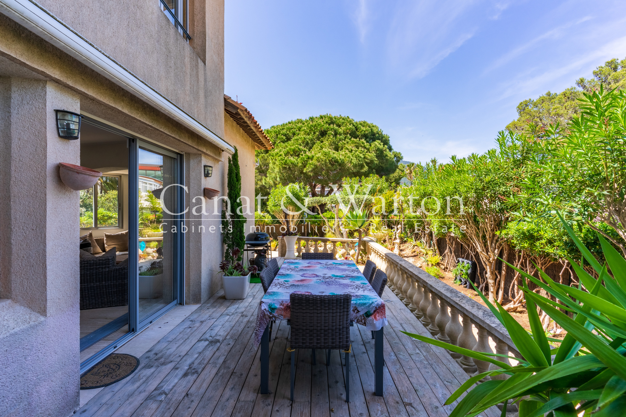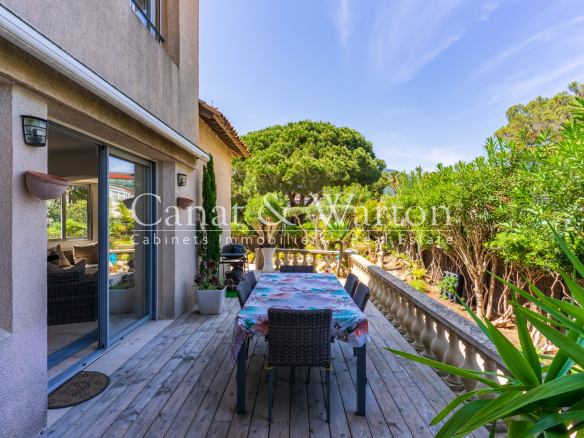 CANAT & WARTON Golfe de Saint Tropez, présente cette villa d’exception au coeur du port de Cavalaire. Idéalement située sur le port de Cavalaire & à quelques pas du centre-ville, cette villa entièrement rénovée & climatisée d’environ 140 m2 sur un terrain plat & cloturé d’environ 350 m2. Elle est composée d’un hall d’entrée, un spacieux séjour/ salle à manger avec une cheminée insert et accès sur 2 terrasses, une cuisine séparée équipée, une suite parentale avec sa salle de douche-wc-dressing et un balcon, 2 chambres, une salle de bain, un large bureau, un espace buanderie et de rangement. Belles terrasses avec une petite piscine. Prestations haut de gamme. Un terrain plat, facile d’accès & arboré. Un abri voiture & annexes viennent colmpléter ce bien. Dossier complet sur demande. Visitez ce bien grâce à sa visite virtuelle. Flavien GRANDMAIRE, directeur de l’agence CANAT & WARTON Golfe de Saint Tropez est à votre disposition au 06 47 52 46 42 cavalaire@canatwarton.com. WE SPEAK ENGLISH-WIR SPRECHEN DEUTSCH. Les informations sur les risques auxquels ce bien est exposé sont disponibles sur le site Géorisques www.georisques.gouv.fr