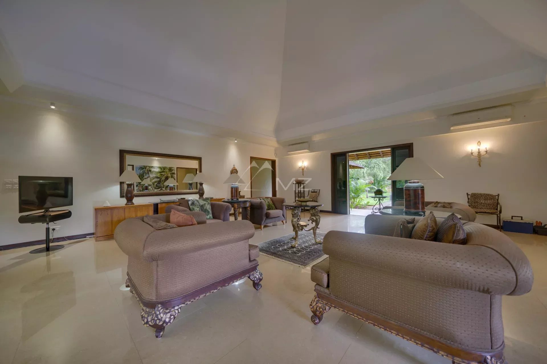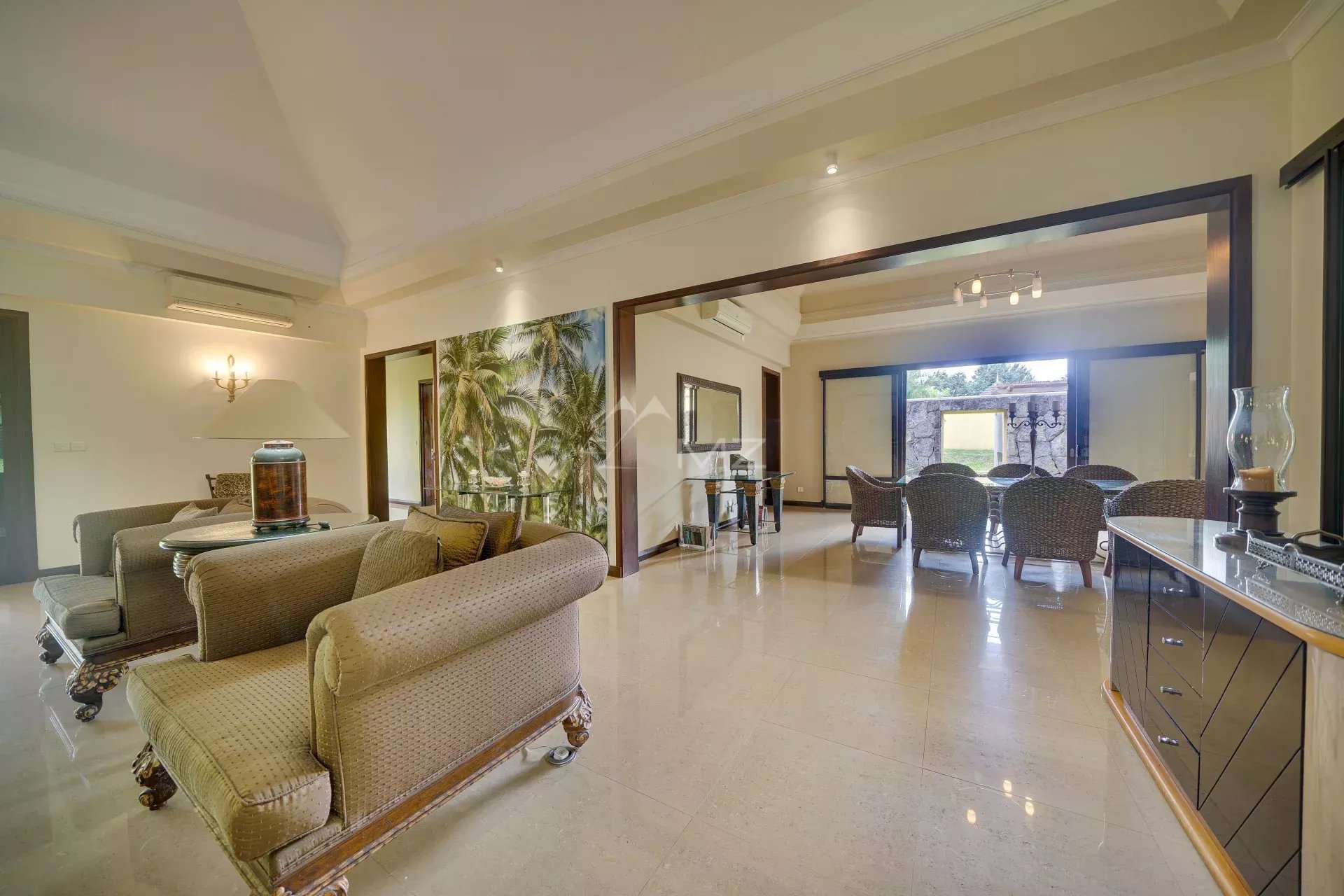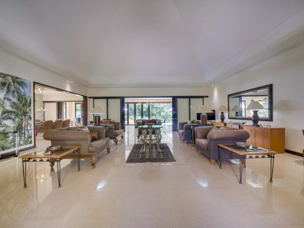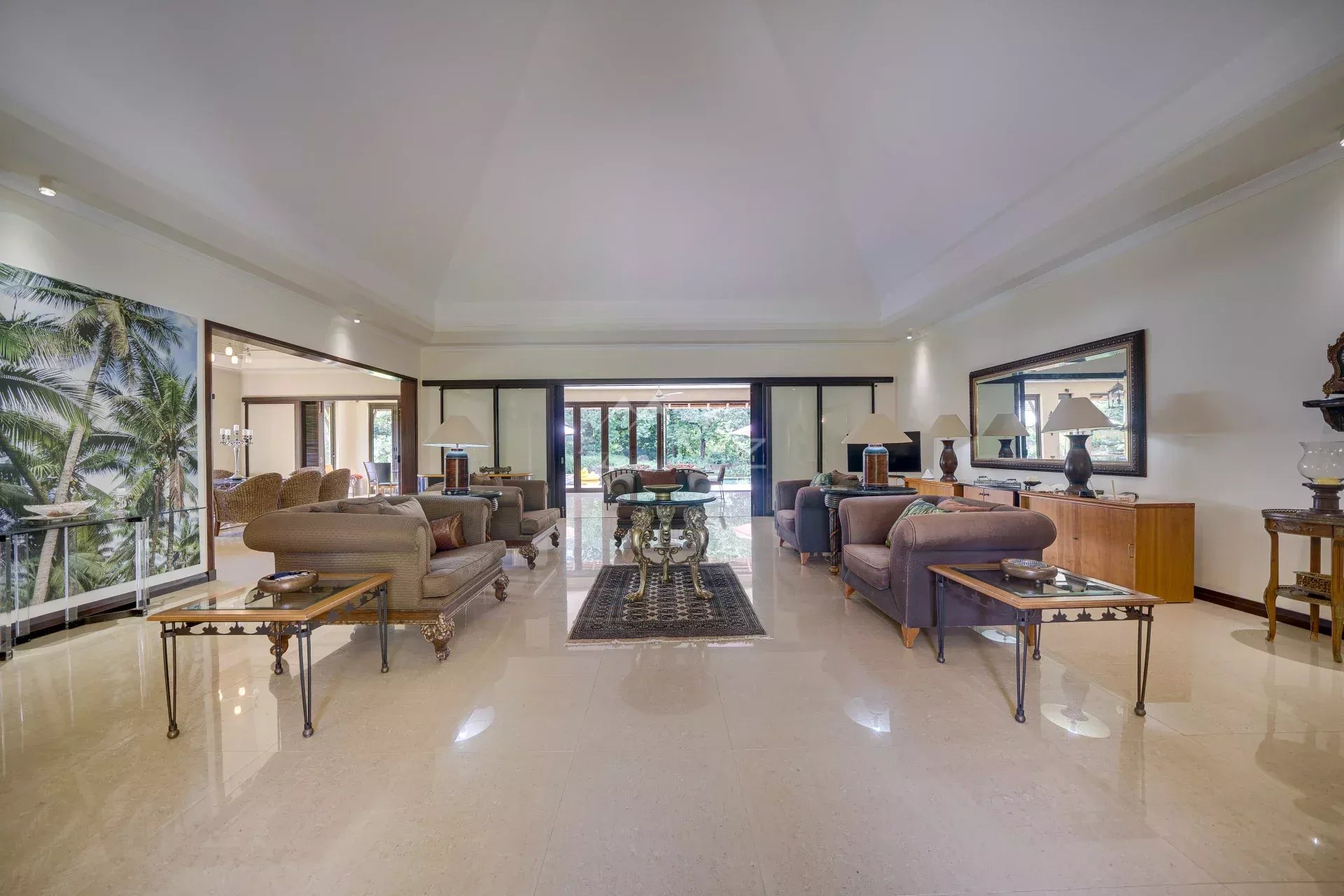 De grandes baies vitrées inondent les espaces de lumière et s’ouvrent sur une vaste véranda couverte offrant une vue imprenable sur les jardins luxuriants.