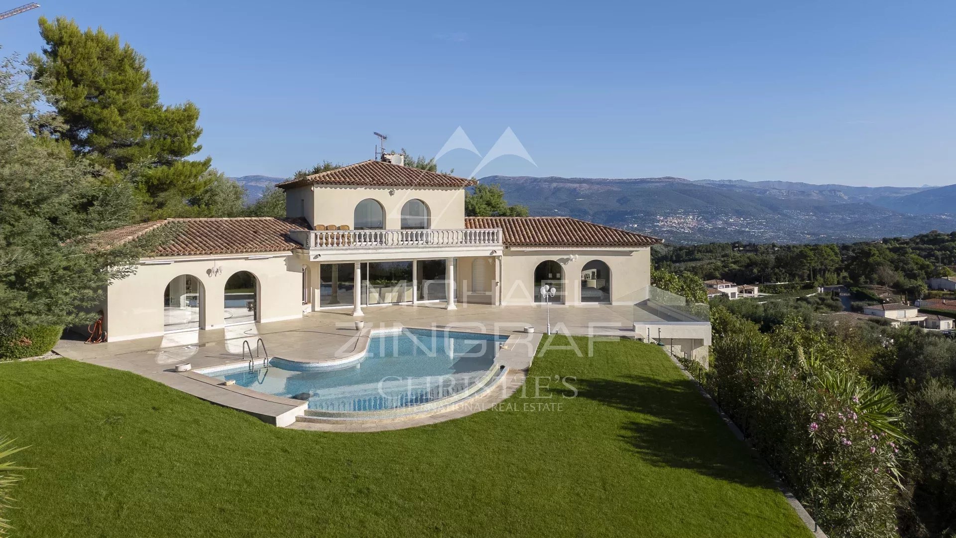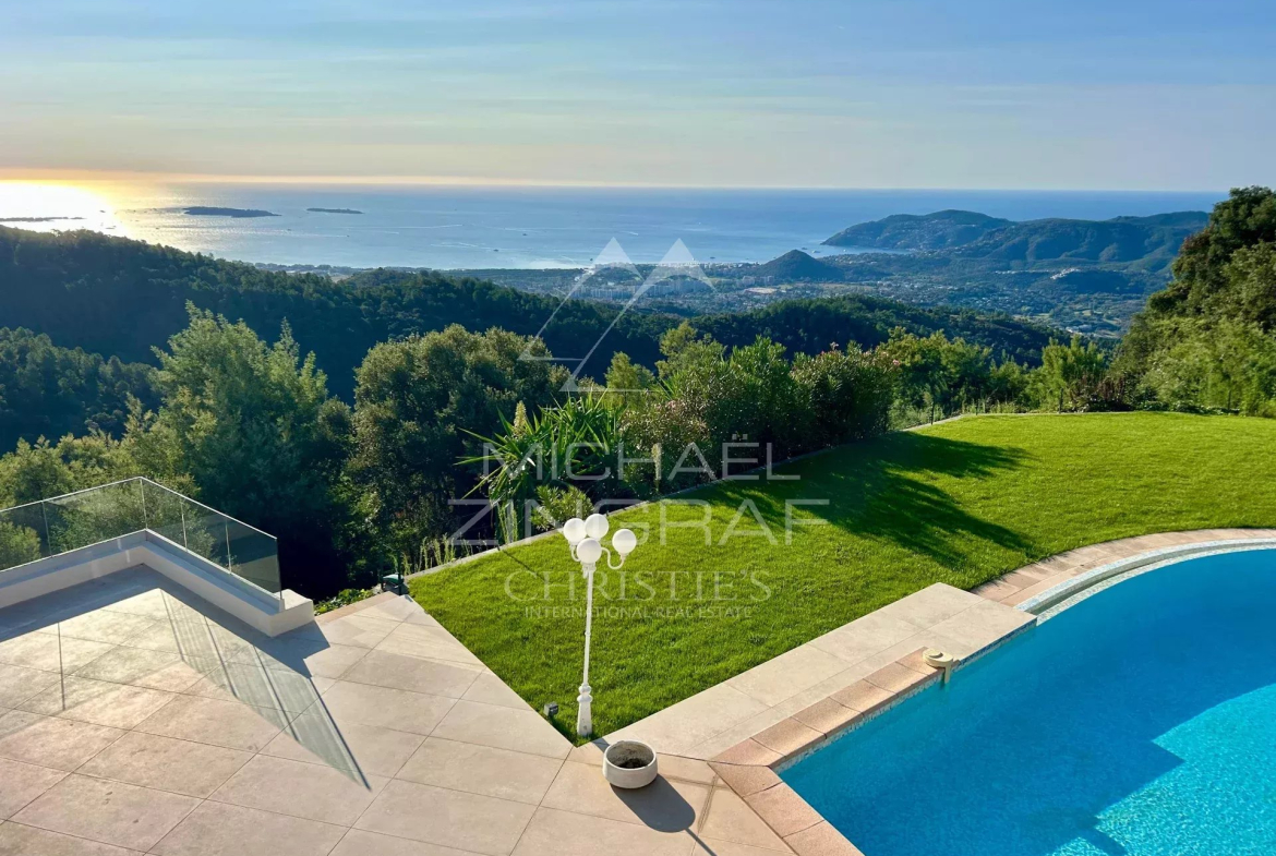 Extraordinaire vue panoramique pour cette villa exposée Sud située à la sortie de Mandelieu la Napoule et au debut de Tanneron soit seulement 11 minutes des commodités, 15 mn des plages et restaurants du port de la Napoule, et 30 minutes de Cannes Croisette. Grand séjour avec cuisine semi-ouverte, 5 chambres vue mer dont 3 de plain pied, grand garage, studio indépendant. À 45 minutes de l’aéroport de Nice.