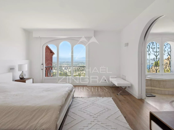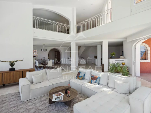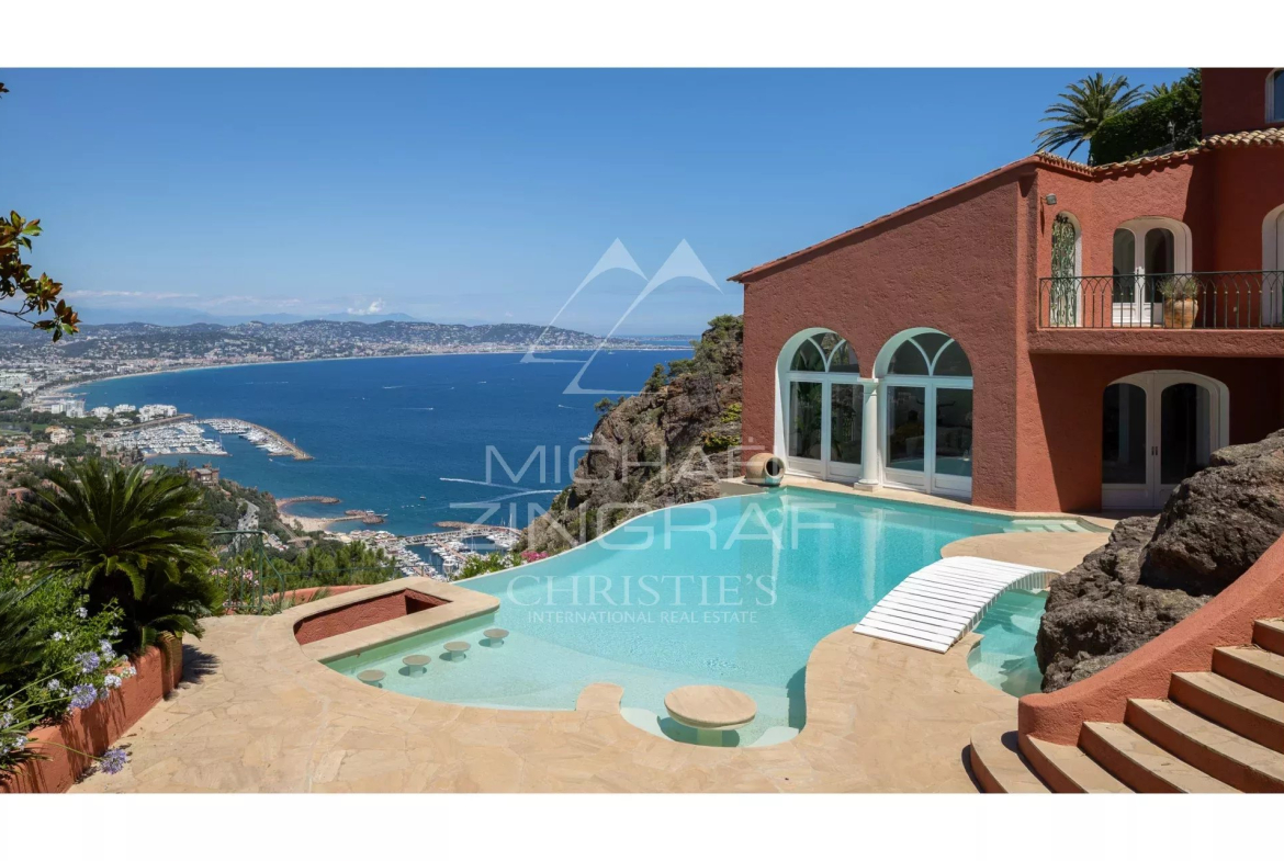 Située face à la baie de Cannes, à flanc de colline et à l’abri des regards, au coeur du plus prisé domaine fermé de Théoule, élégante propriété entièrement rénovée offrant une vue exceptionnelle sur la mer et l’Estérel.