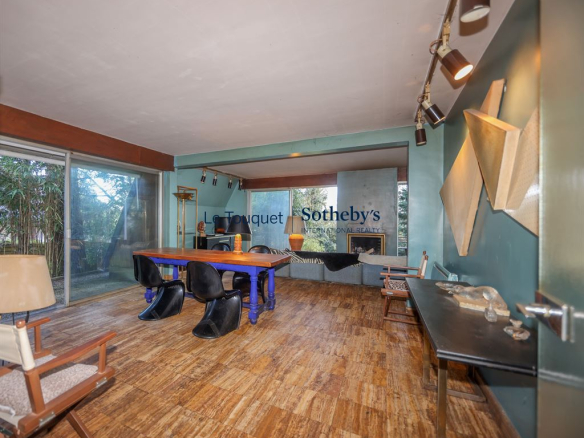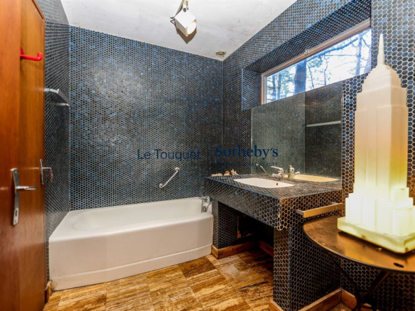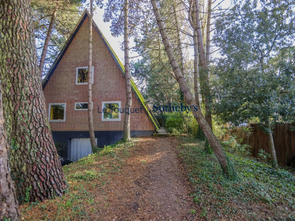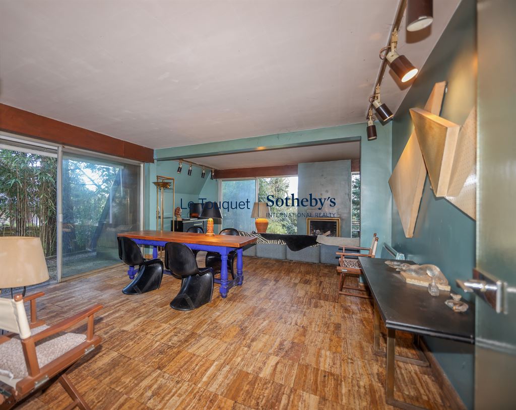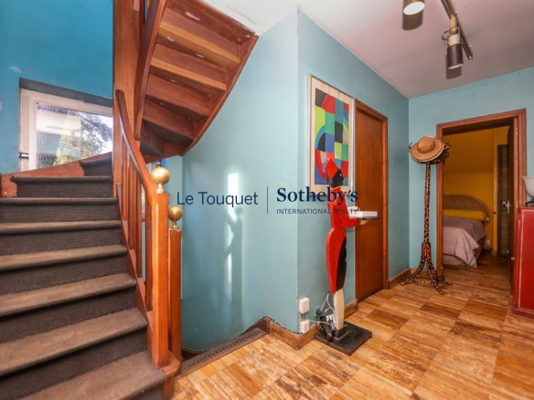 En exclusivité, le Touquet Sotheby’s vous propose à proximité immédiate du Golf, belle villa de l’architecte Paul Pamart qui affiche une signature singulière. Erigée sur une parcelle de près de 1200 m2, elle offre une spacieuse réception avec de larges baies vitrées qui encadrent une cheminée et donnent accès à la terrasse qui surplombe le jardin. Sur ce même niveau une entrée avec toilettes, une cuisine séparée et un premier espace nuit avec chambre et salle de bains permettent la vie de plain pied. A l’étage, un couloir distribue 3 chambres et une petite salle de bains ainsi que de nombreux rangements.