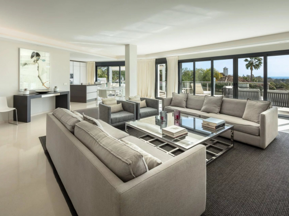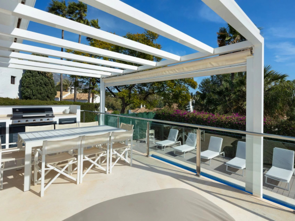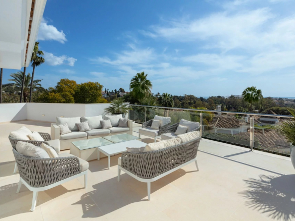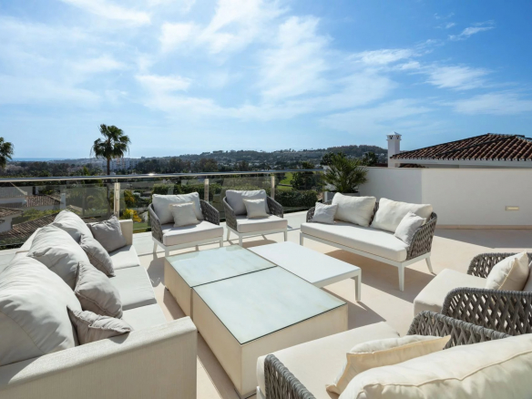 La terrasse solarium de 90 m2 offre une vue magnifique sur la montagne de la Concha à l’est, sur le terrain de golf et Puerto Banus au sud et sur le soleil du soir à l’ouest.