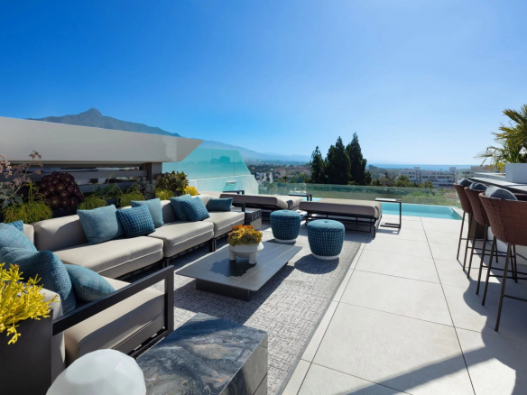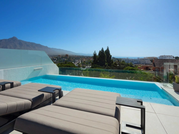 Une piscine privée ajoute à l’attrait, tandis que le solarium sur mesure offre une vue panoramique sur Nueva Andalucia, La Concha, la mer Méditerranée et Gibraltar.