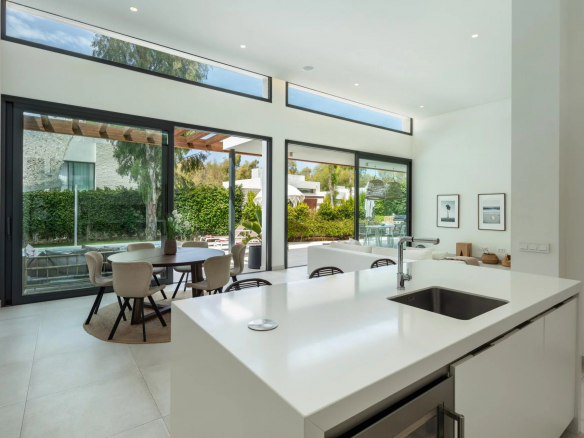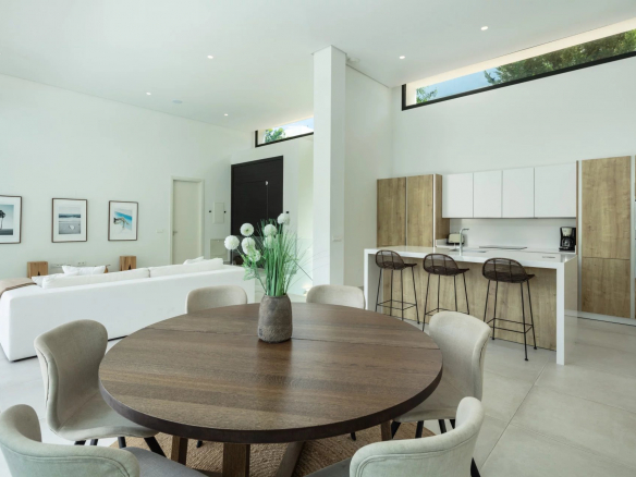 La disposition ouverte facilite une circulation fluide entre les espaces intérieurs, tandis que de nombreuses fenêtres remplissent la propriété de lumière naturelle.