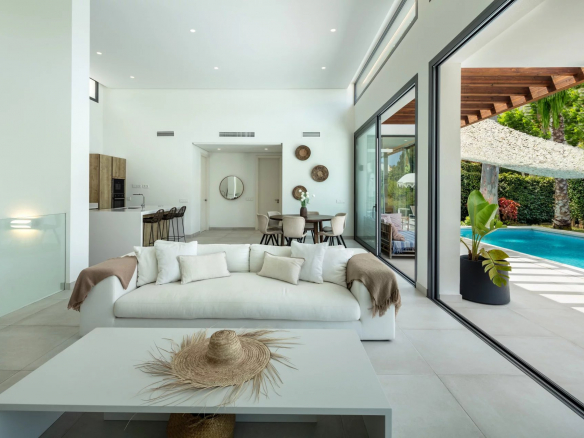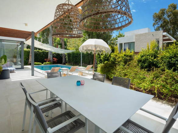 Cette villa captivante impressionne par sa conception architecturale unique, mettant en vedette une structure en forme de dôme au cœur de sa façade extérieure. Ses murs blancs et ses tuiles andalouses traditionnelles ajoutent une touche de charme classique.