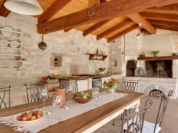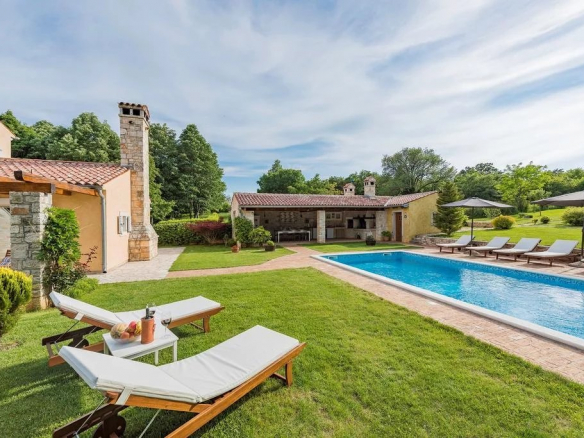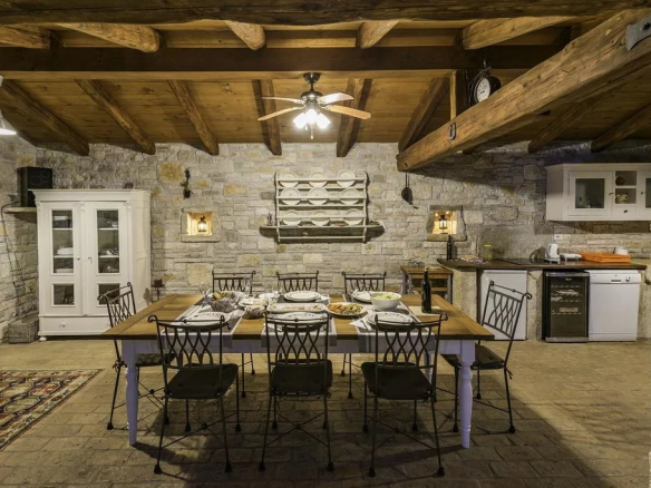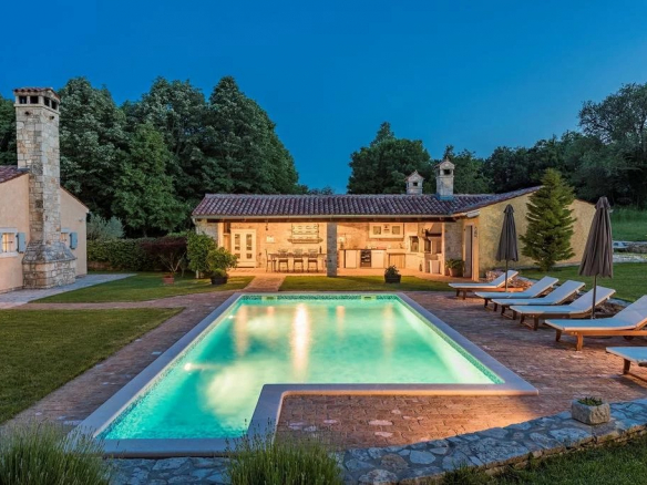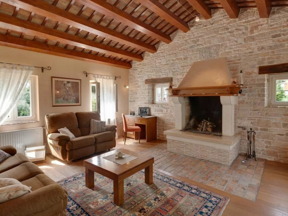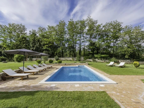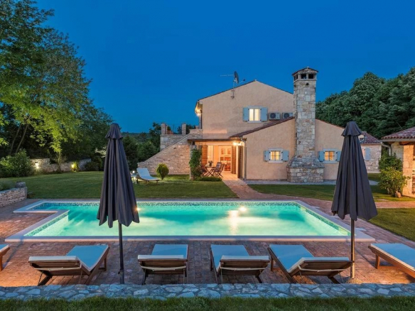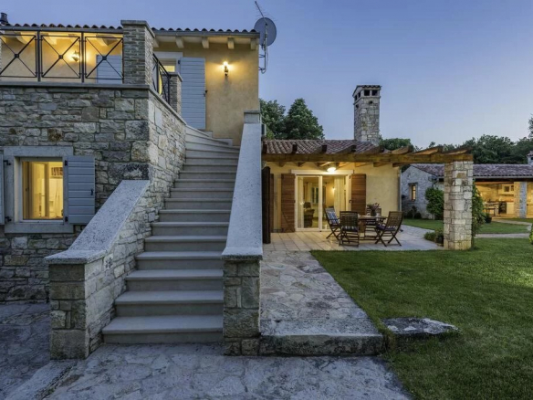 Luxe de style ferme, villa entièrement climatisée avec 4 chambres, 4 salles de bains, une cuisine d’été (38 m2), cave à vin, sauna, grande piscine et jardin. Piscine dimension 9,00 mx 4,5 m, profondeur 1,35 m, douche, eau semi salée Rez-de-chaussée – 149,30 m2 – salle à manger (21.00 m2), salon avec cheminée (30.00 m2) et cuisine (13.00 m2) sont tous dans un seul espace. Le garde-manger assez grand (4,5 m2) appartient à la cuisine. Le premier étage (44,00 m2) a une salle de bain (3. 7 m2) avec douche et les deux chambres doubles (12,00 m2 et 17,00 m2). De la plus grande salle s’ouvre sur la terrasse (porche) 16,00 m2. Au sous-sol se trouve un sauna mixte de 6m2 (sec et humide) avec une douche. Près du sauna se trouve une cave à vin (12 m2), où vous pourrez déguster les vins d’Istrie de haute qualité.