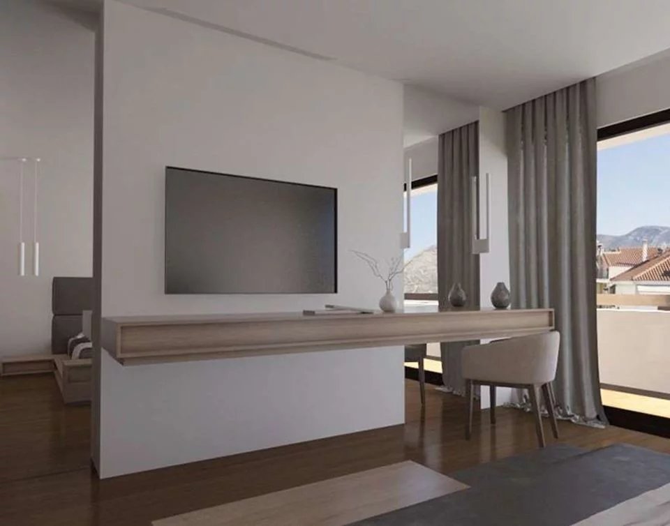 L’entrée principale au rez-de-chaussée (141 m²) mène à un espace ouvert. Un salon spacieux et lumineux avec une cheminée centrale s’ouvre sur deux côtés offrant une vue fabuleuse. Un peu plus loin se trouvent la future salle à manger et un espace fonctionnel pour la cuisine. Les baies vitrées et les vitrines de portes en verre permettent à la chaleur du soleil athénien d’embrasser l’intérieur et d’améliorer la vue sur la verdure au-delà. Le salon principal mène au jardin avant et au jardin arrière qui peut accueillir un coin salon en plein air avec barbecue et chaises longues à côté de la terrasse d’une piscine de 35 m².