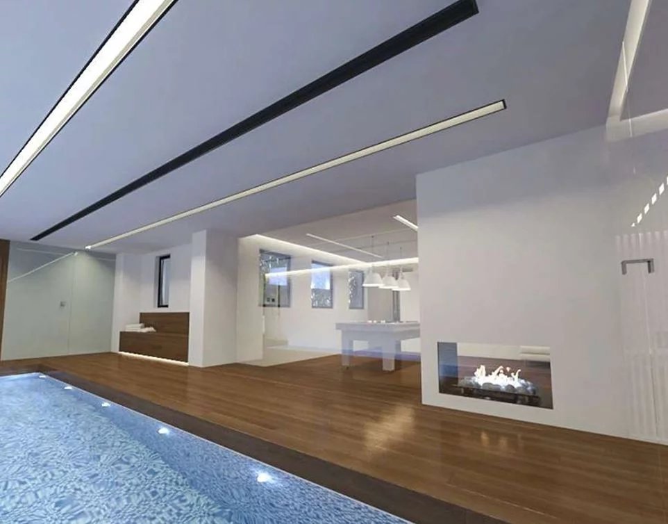 Le niveau de la salle de jeux (159 m²) se compose d’une grande pièce qui est prévue pour accueillir plusieurs installations telles qu’une salle de sport, un sauna et une piscine intérieure chauffée de 15 m², ainsi que les logements du personnel et une kitchenette.