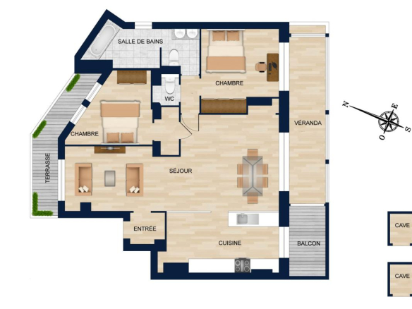 Deux vraies chambres, calmes et lumineuses, dont une avec terrasse privative de 6 m².?Le plan — sans aucune perte — permet d’en créer une troisième très facilement, pour les besoins d’une famille ou d’un bureau indépendant.?Salle de bain complète avec baignoire d’angle, douche et WC, plus un second WC séparé (parce qu’on sait que ça compte).?Nombreux rangements intégrés, deux caves, et la possibilité de reprendre la location d’un grand box à deux minutes à pied.