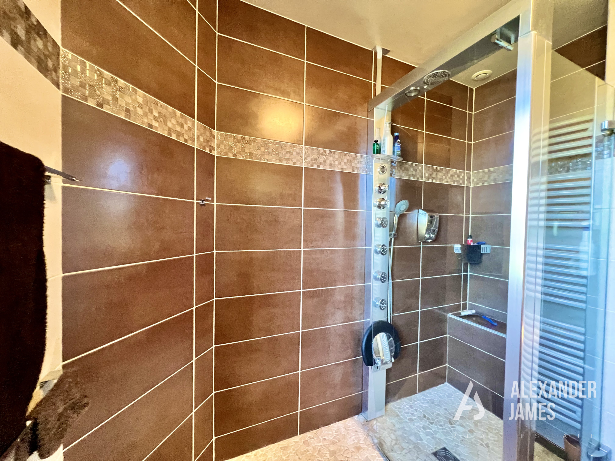 Le premier étage offre une magnifique terrasse couverte en forme de L avec de belles vues, (49m2) accessible par un escalier extérieur et qui donne un accès direct à la suite parentale et à l’une des deux autres chambres doubles.