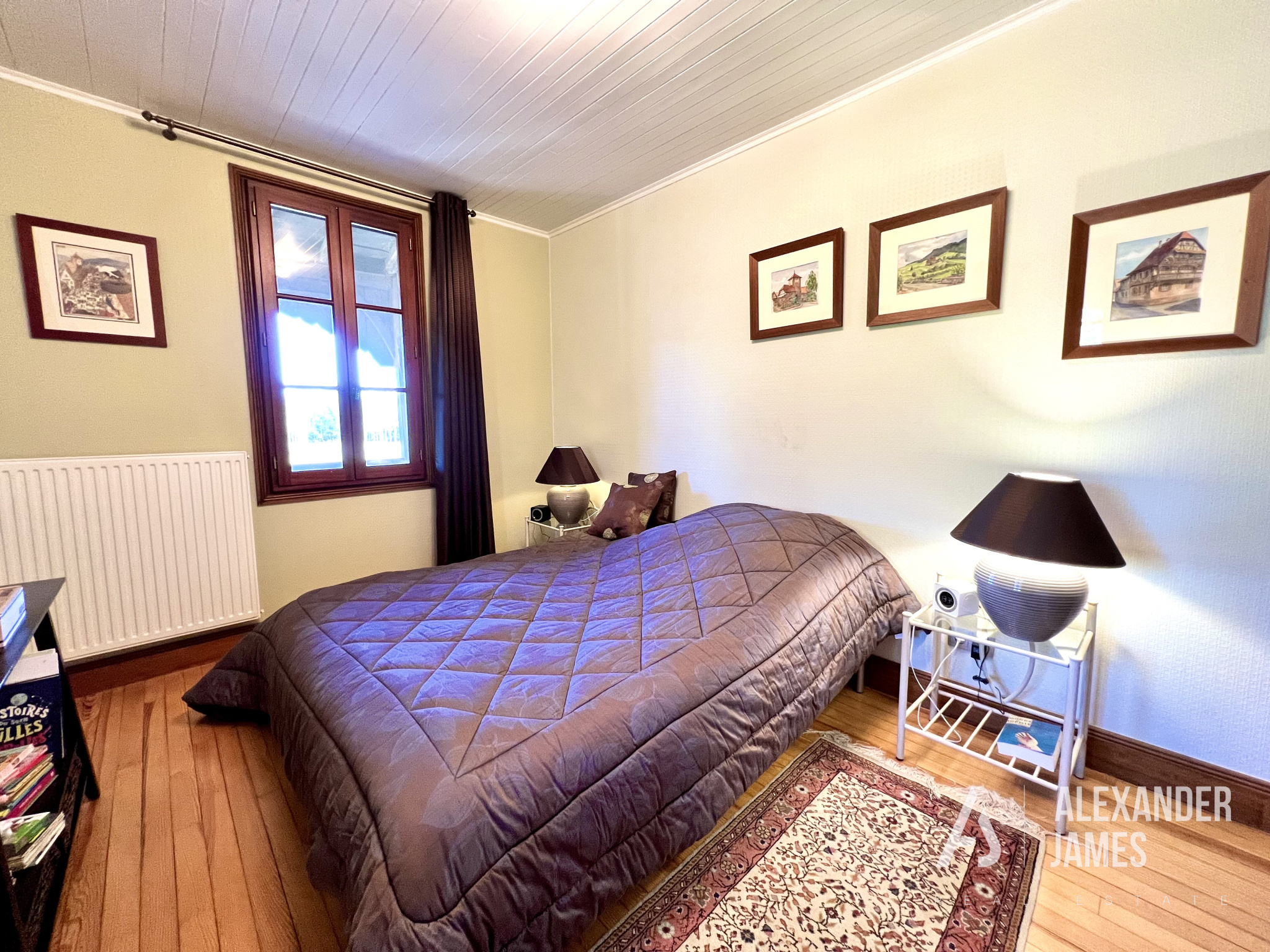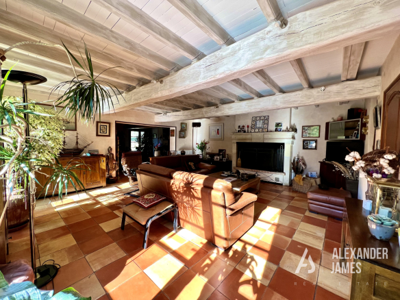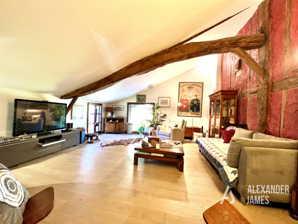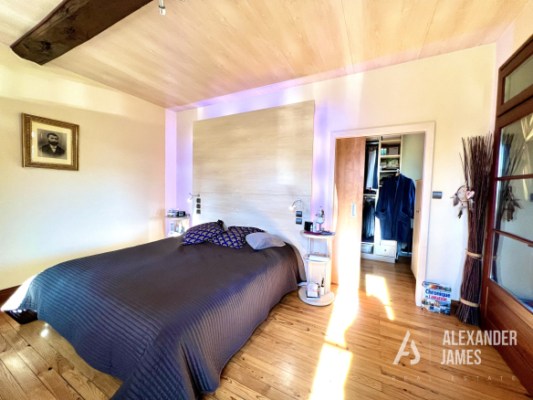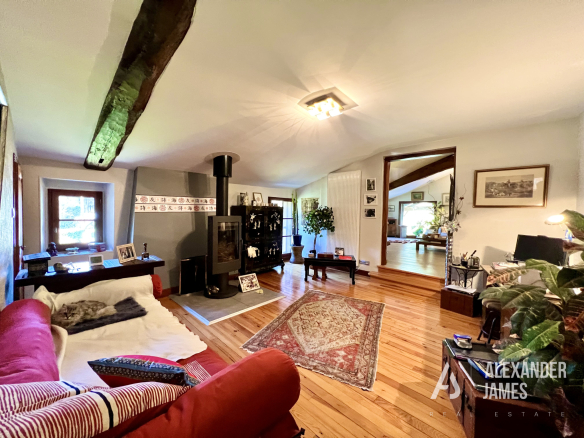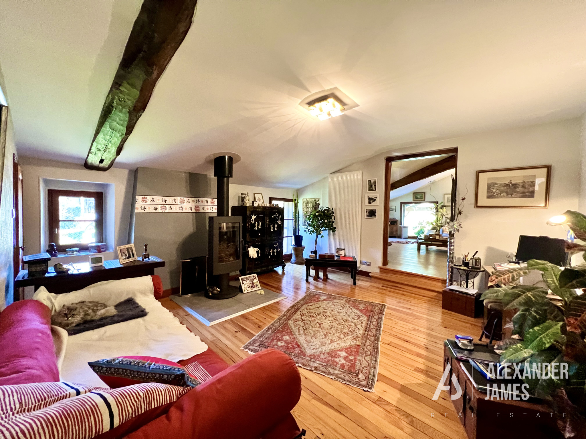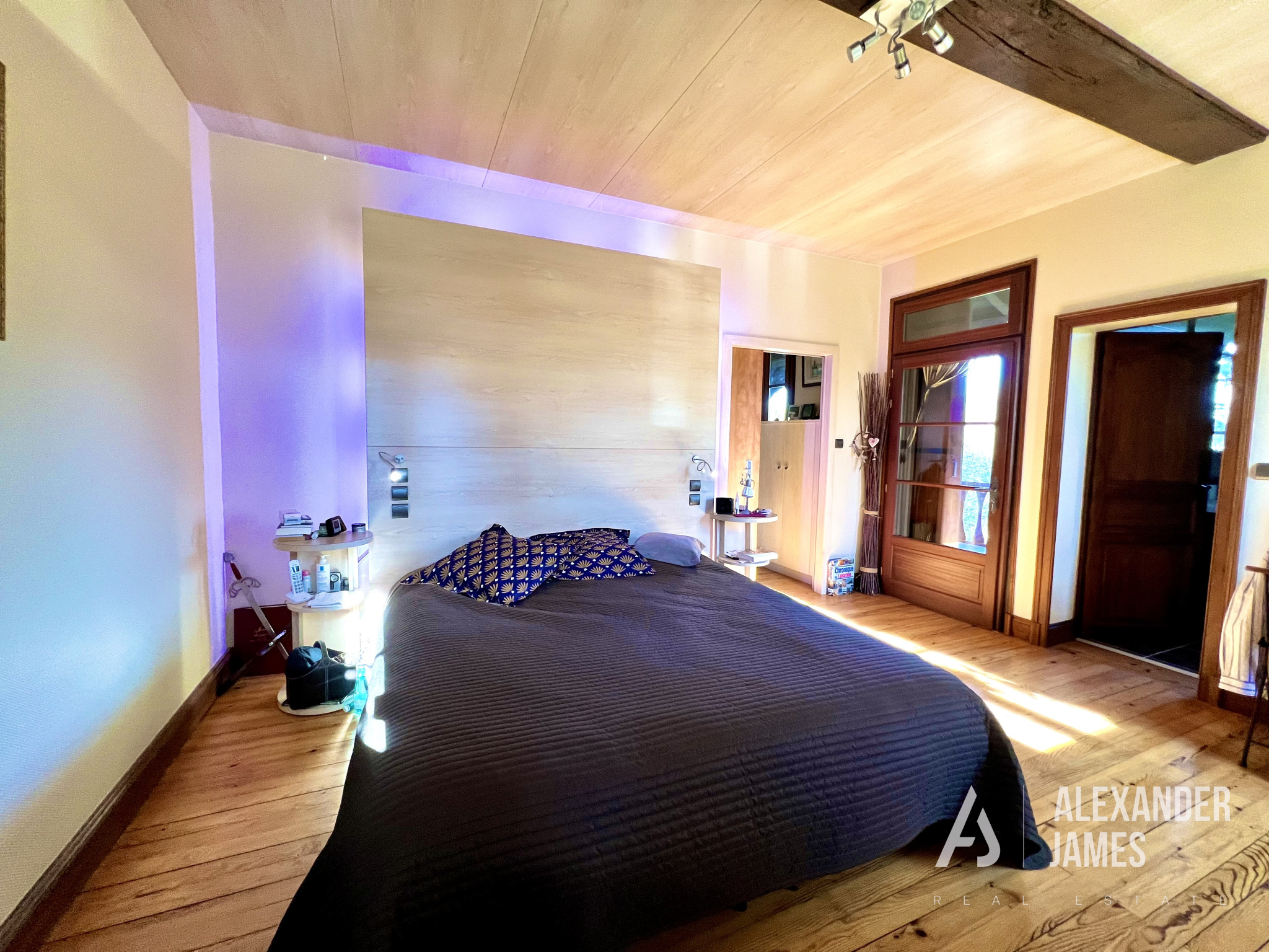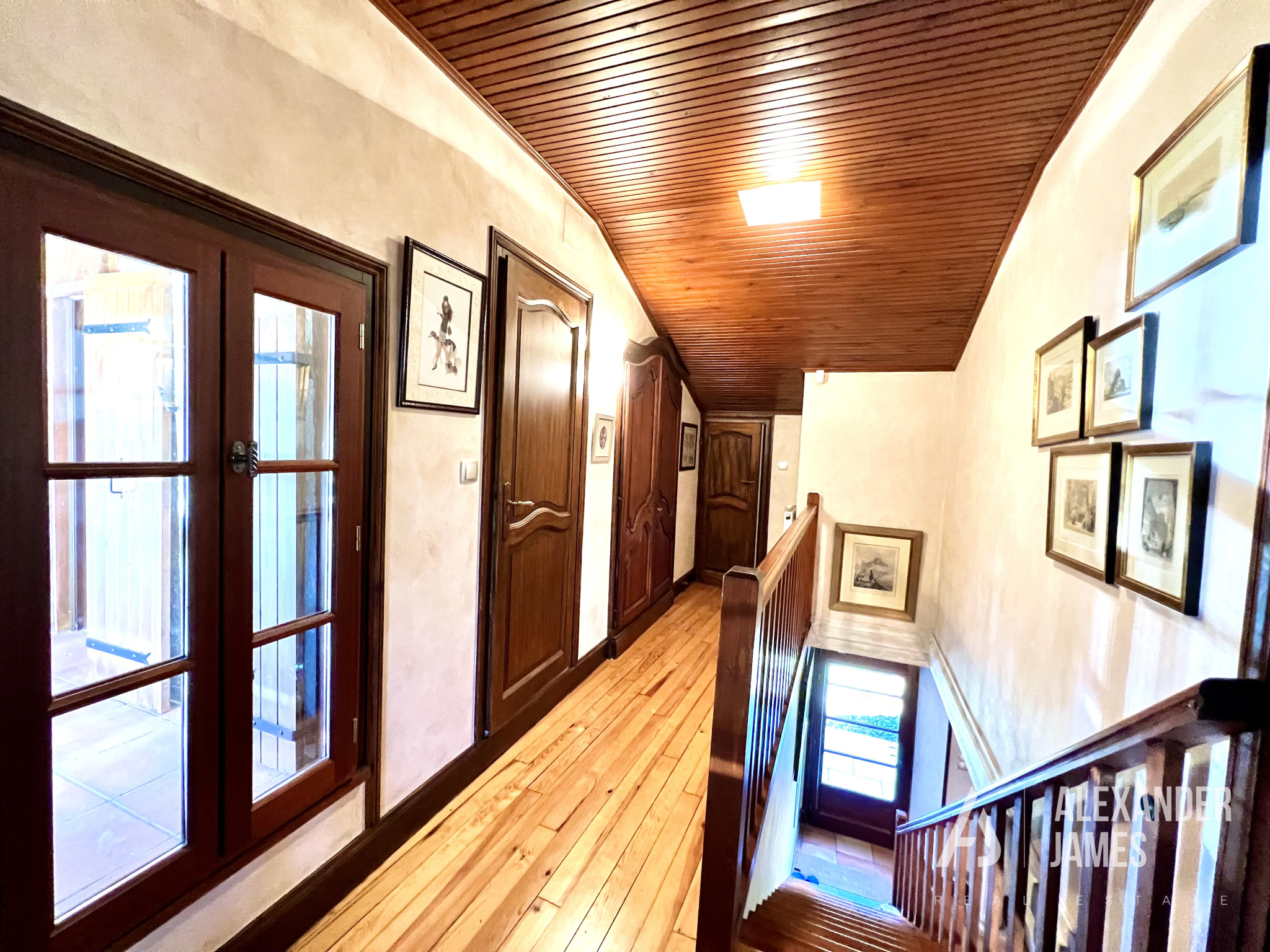 Au premier étage, un palier mène à un autre salon voûté et un grand bureau avec un poêle à bois, la suite parentale avec sa salle de douche en suite, un dressing et un accès direct à une très grande terrasse couverte au premier étage, il y a 2 autres chambres doubles et une salle de bain familiale.