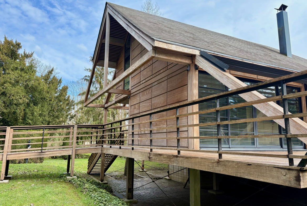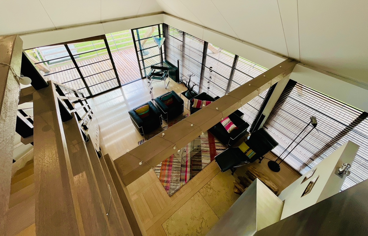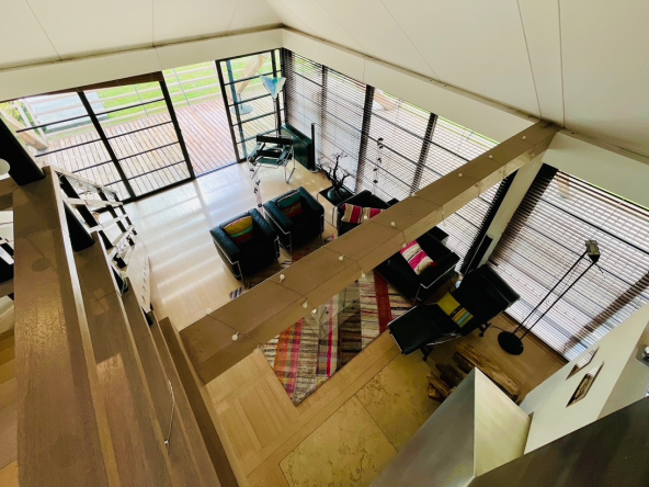 Découvrez cette propriété d’exception qui semble flotter entre ciel et nature, suspendue dans un équilibre subtil entre modernité et environnement. Bordée par une rivière sinueuse dont le murmure berce les lieux, elle s’ouvre à la lumière et au paysage par de larges baies vitrées.