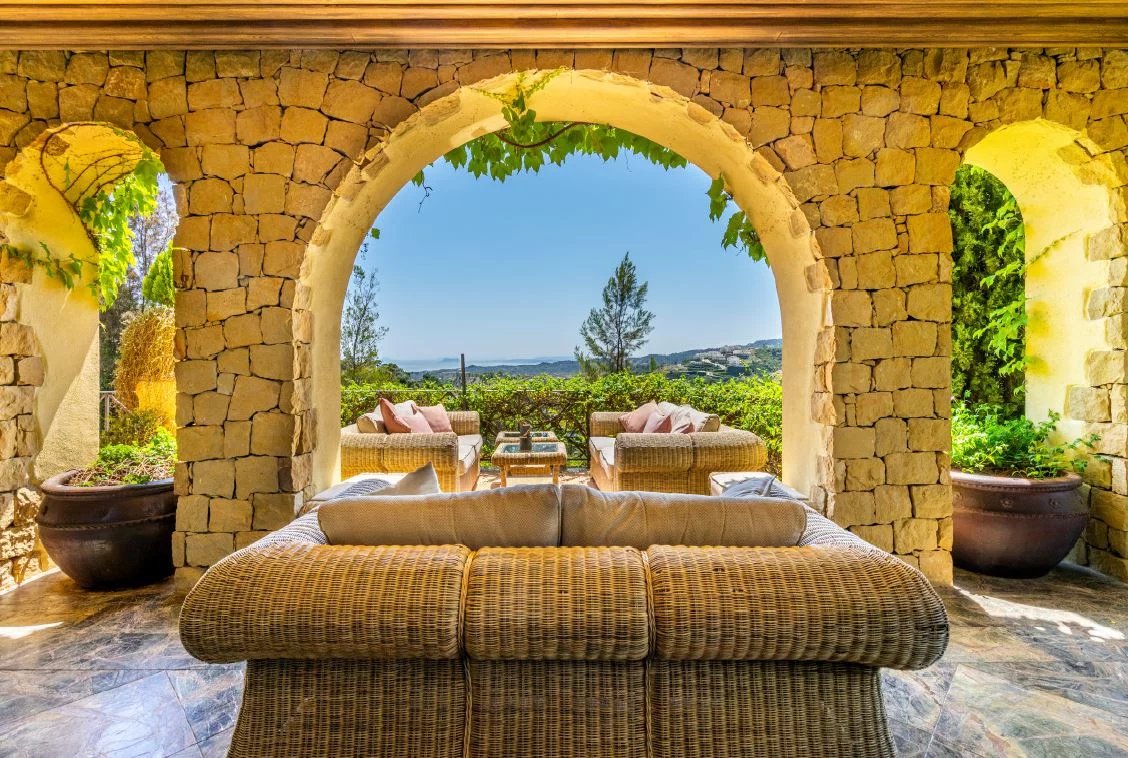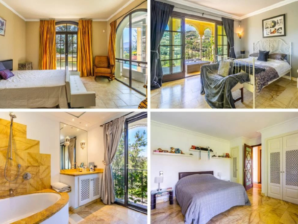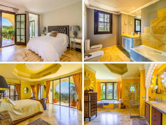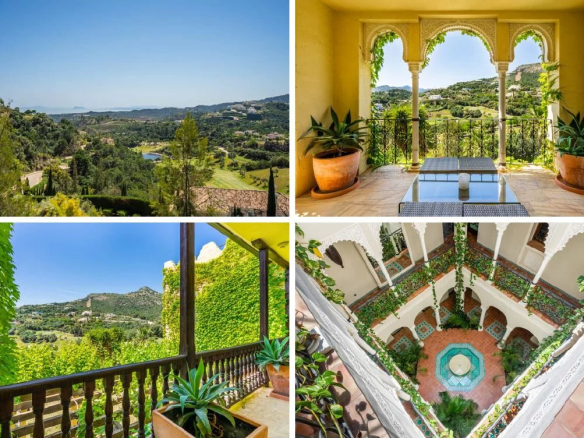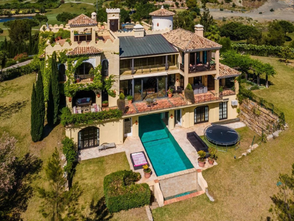 The main entrance to the property is located at ground level and leads through the Andalucian style atrium to a large vaulted living room which has a double-height ceiling complete with a working fireplace with floor to ceiling sliding steel doors giving direct access to the terrace and magnificent golf and sea views. It houses a bespoke fitted kitchen connected to the formal dining area. Ceiling height sliding doors lead out onto the terrace with a built-in barbecue, offering easy access to alfresco dining. The property offers 5 large double bedrooms all with individual en suite bathrooms, each having its large terrace with the enchanting views the villa has to offer.