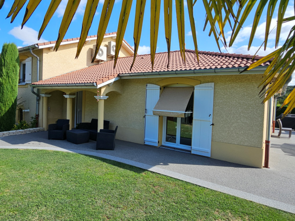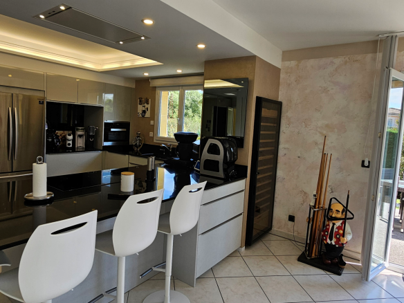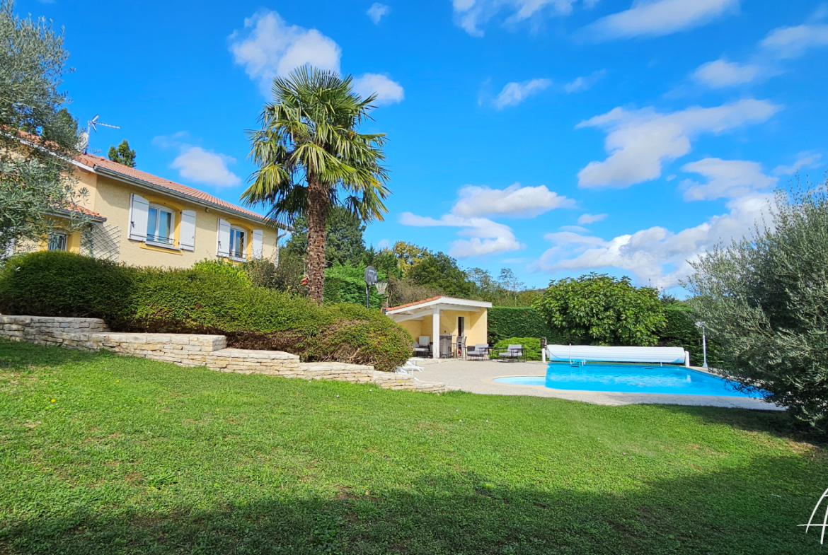 Exclusivité : A moins de 20mn du coeur de Lyon, ressourcez-vous toute l’année à Brignais dans le secteur résidentiel ‘les Collonges’, dans un cadre calme et verdoyant. Découvrez cette superbe villa familiale avec un terrain clos arboré de plus de 1700m2. Vaste pièce de vie carrelée de 65m2 avec cuisine US récente ouverte sur le séjour, cellier attenant. L’ensemble ouvrant sur les terrasses ensoleillées, le jardin méditérranéen, la piscine 5x10m et son pool house. A l’étage suite parentale avec salle d’eau et dressing (pouvant redevenir une chambre), 2 autres chambres avec placard penderie aménagé, 1 salle de bain, WC indépendant. Vous serez séduit par la qualité des prestations, les matériaux et équipements hauts de gamme en particulier dans les sanitaires et la cuisine qui proposent un plan de travail et une table haute en granit noir et un électroménager complet, dont un dispositif automatique d’aspiration des miettes. Plus de 90 m2 d’espaces supplémentaires en sous-sol viennent enrichir les prestations avec sauna, WC, buanderie, bureau, atelier et permettent d’accéder directement aux 2 garages (isolés et climatisés). La propriété possède également un studio d’amis indépendant avec tout le confort, kitchenette, salle d’eau, WC indépendant, chambre, complété à l’extérieur d’un espace dédié à la condition physique. Villa comme studio d’amis sont climatisés. Petit plus, sur la terrasse, un four à pizza / barbecue ravira vos proches. L’entrée de la propriété permet de stationner sur son parking 3 à 4 véhicules, l’ensemble permettant ainsi de recevoir convenablement amis, parents et grands enfants. Le jardin et les allées de circulation sont très bien entretenus. La propriété dispose de son puit et, pour les amateurs, d’un terrain de boules. A proximité : commerces, éducation, loisirs, restauration, santé Transports : Bus ‘Bernicot’ à 400m, gare de Chaponost à 900m et Métro de St Genis ‘Hôpital Lyon Sud’ à 3.5km Le coin de la technique : Aspiration centralisée, fenêtres et portes vitrées sont en double vitrage avec isolation thermo-acoustique renforcée. PAC air/air réversible renforcée par une chaudière gaz à condensation Frisquet pour le chauffage plancher et la production d’eau chaude sanitaire. Fibre optique, alarme, vidéo-surveillance, domotique, …, permettant de gérer et surveiller la maison à distance. Impossible de lister ici toutes les prestations permettant de ravir petits et grands. Contactez-moi !