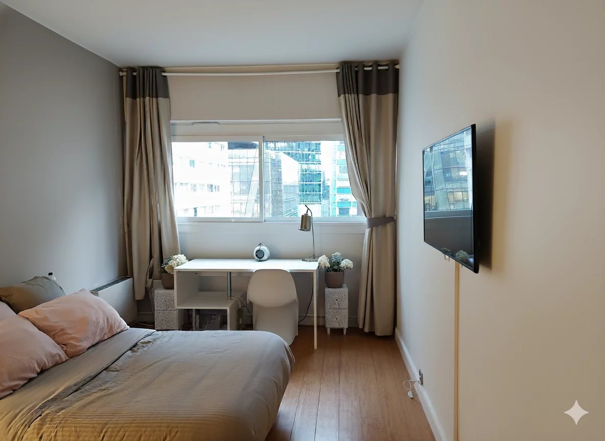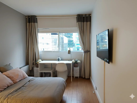 À l’extérieur, une terrasse aménagée de 16,50 m², dotée d’un point d’eau et d’un éclairage soigné, offre un espace privilégié pour savourer des instants de calme et de contemplation, face à un panorama urbain d’exception.