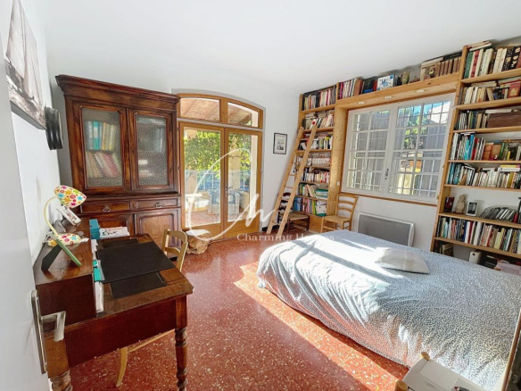 À l’étage, un espace lecture baigné de lumière distribue trois chambres, dont une bénéficiant d’une tropézienne intime, parfaite pour profiter du soleil en toute tranquillité.