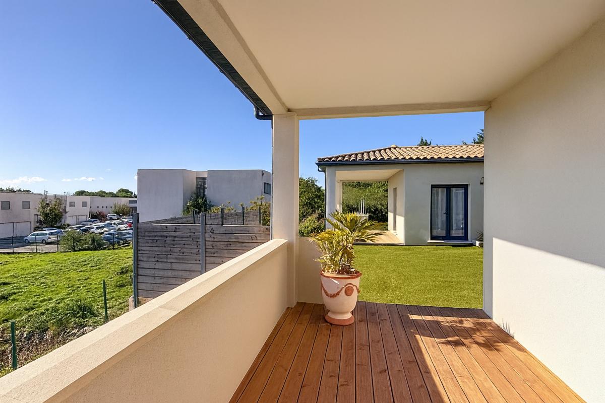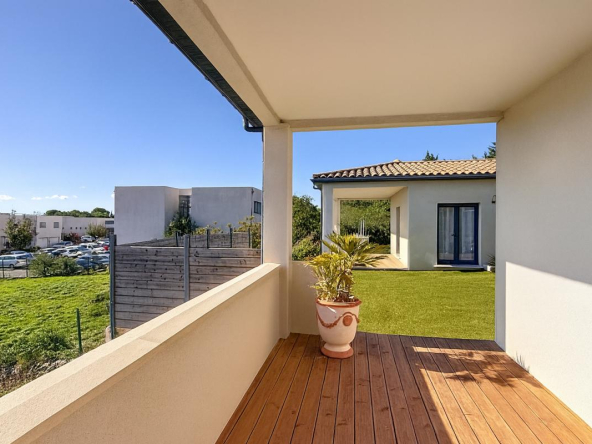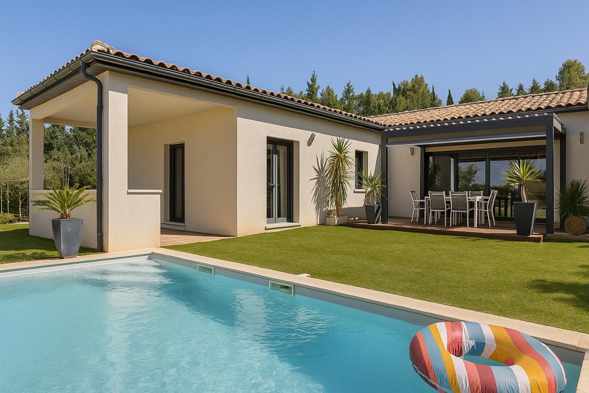 La maison profite de plusieurs terrasses bien orientées. La principale, plein sud, est équipée d’une pergola bioclimatique motorisée. Une seconde terrasse est accessible depuis la suite parentale et une troisième depuis l’une des chambres, permettant à chacun de profiter d’un accès extérieur privatif.