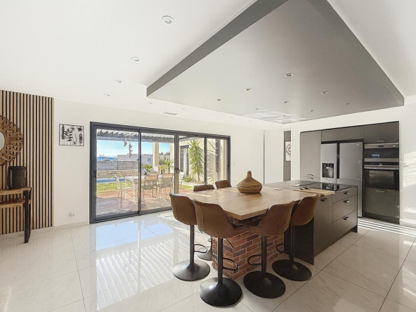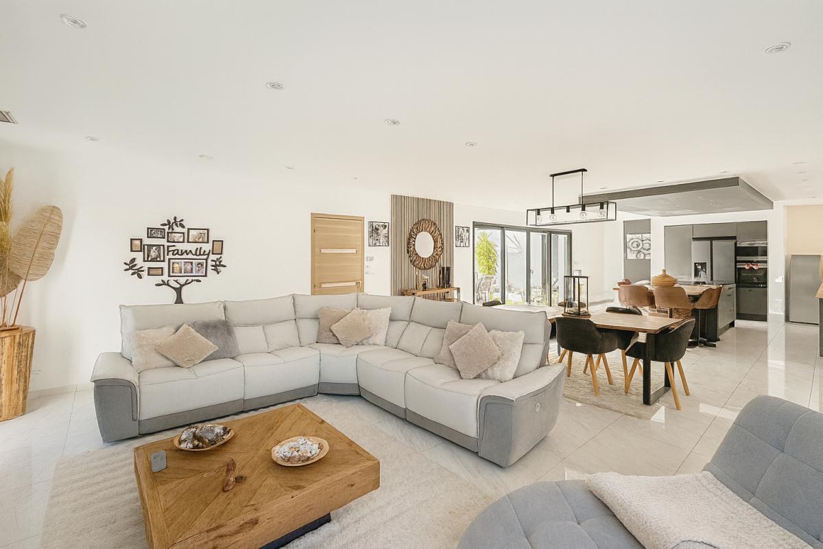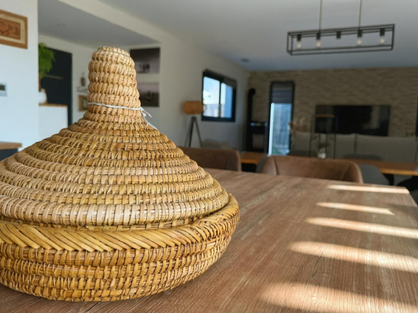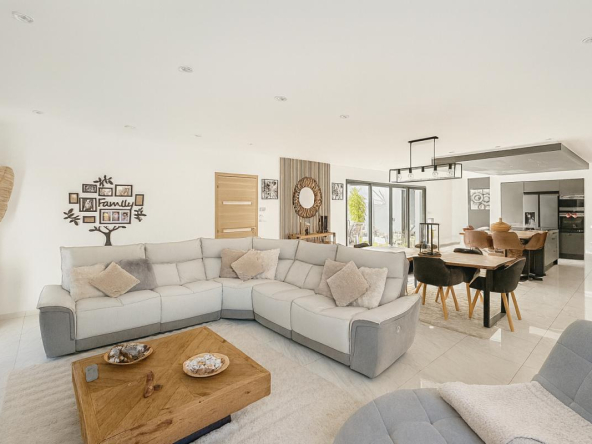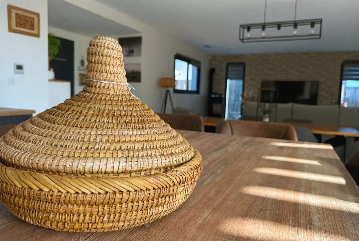 Conçue de plain-pied, elle propose une pièce de vie spacieuse et lumineuse de 70 m² avec cuisine ouverte aménagée et équipée. L’espace nuit se compose d’une suite parentale et de trois chambres supplémentaires. Chaque pièce bénéficie de larges baies vitrées en double vitrage aluminium noir, installées en 2019, offrant confort et luminosité.